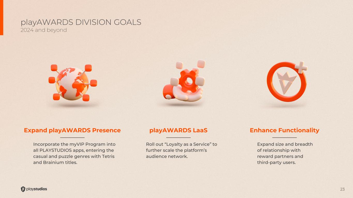 23 Expand playAWARDS Presence playAWARDS DIVISION GOALS 2024 and beyond Incorporate the myVIP Program into all PLAYSTUDIOS apps, entering the casual and puzzle genres with Tetris and Brainium titles. playAWARDS LaaS Roll out “Loyalty as a Service” to further scale the platform’s audience network. Enhance Functionality Expand size and breadth of relationship with reward partners and third-party users.