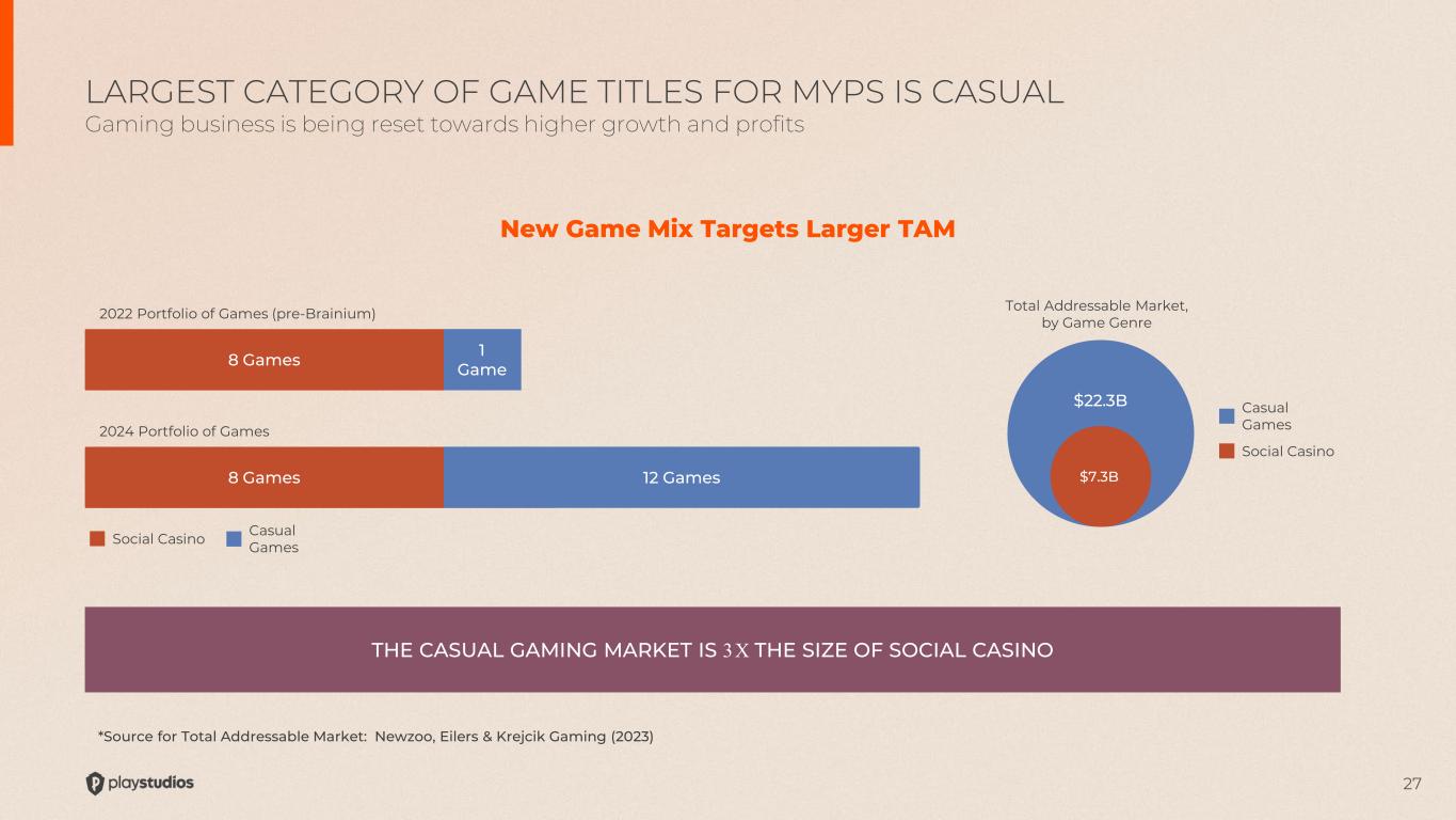 26 Advertising is a meaningful portion of total revenues Advertising is higher margin - no platform fees Advertising/Other is now 20% of Total Revenues Scaling Advertising in social casino portfolio Tetris and Brainium are Advertising driven games SHIFT TO CASUAL GAMES IS RAISING MARGINS Gaming business is being fundamentally reset towards higher profit Revenue Mix 2022 IAP Advertising Other Revenue Mix 2023 IAP Advertising Other