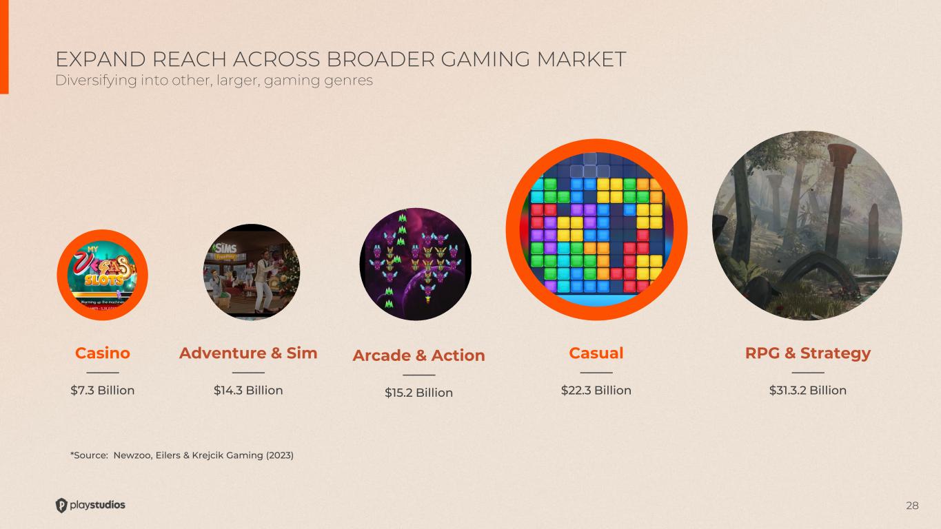 27 THE CASUAL GAMING MARKET IS 3X THE SIZE OF SOCIAL CASINO New Game Mix Targets Larger TAM 2024 Portfolio of Games 2022 Portfolio of Games (pre-Brainium) Social Casino Casual Games $7.3B Total Addressable Market, by Game Genre $22.3B 1 Game 8 Games 12 Games Social Casino Casual Games LARGEST CATEGORY OF GAME TITLES FOR MYPS IS CASUAL Gaming business is being reset towards higher growth and profits *Source for Total Addressable Market: Newzoo, Eilers & Krejcik Gaming (2023) 8 Games