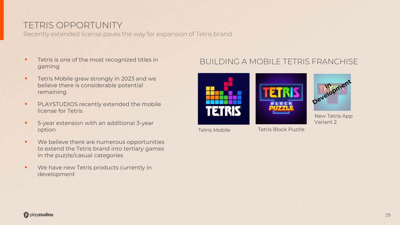 29  Tetris is one of the most recognized titles in gaming  Tetris Mobile grew strongly in 2023 and we believe there is considerable potential remaining  PLAYSTUDIOS recently extended the mobile license for Tetris  5-year extension with an additional 3-year option  We believe there are numerous opportunities to extend the Tetris brand into tertiary games in the puzzle/casual categories  We have new Tetris products currently in development TETRIS OPPORTUNITY Recently extended license paves the way for expansion of Tetris brand Tetris Mobile New Tetris App Variant 2 BUILDING A MOBILE TETRIS FRANCHISE Tetris Block Puzzle