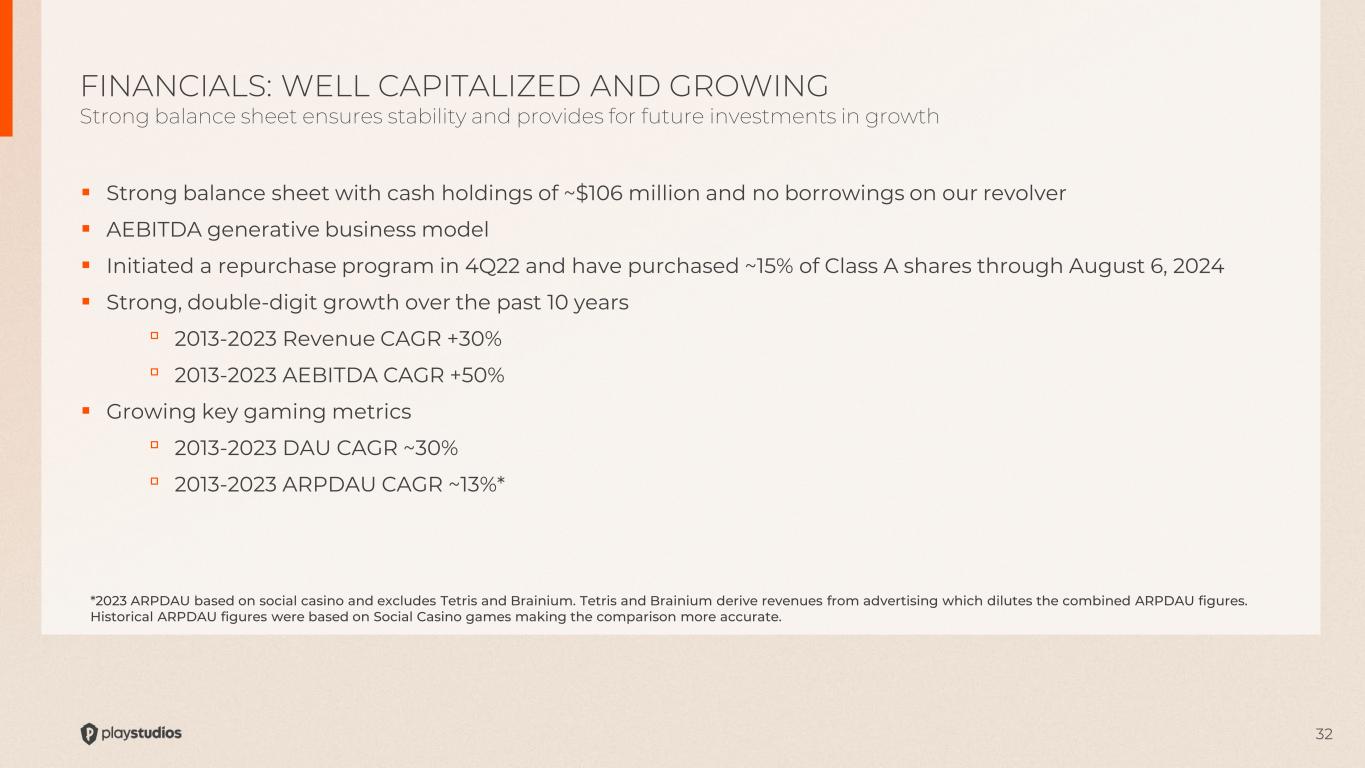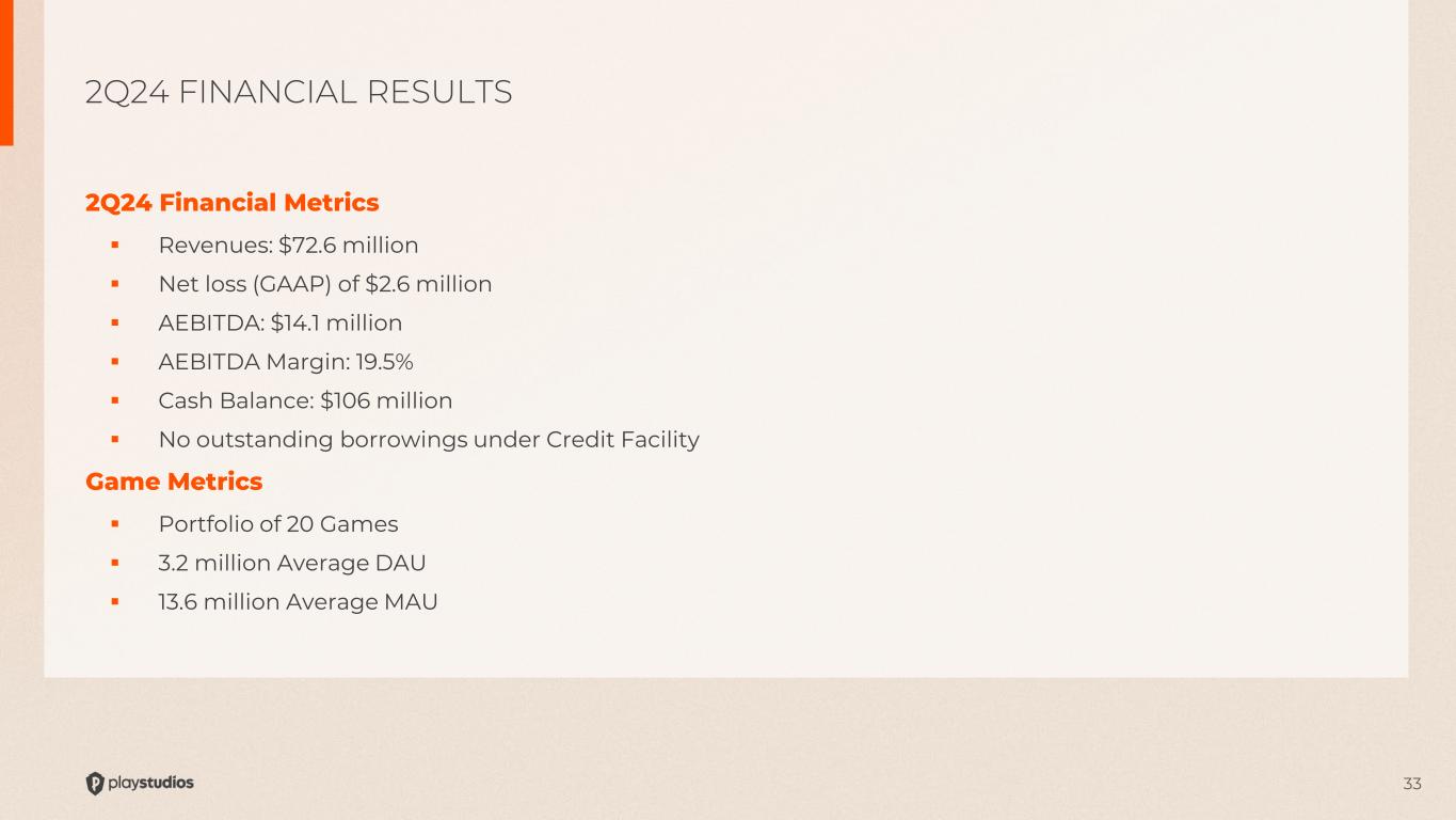 32  Strong balance sheet with cash holdings of ~$106 million and no borrowings on our revolver  AEBITDA generative business model  Initiated a repurchase program in 4Q22 and have purchased ~15% of Class A shares through August 6, 2024  Strong, double-digit growth over the past 10 years ▫ 2013-2023 Revenue CAGR +30% ▫ 2013-2023 AEBITDA CAGR +50%  Growing key gaming metrics ▫ 2013-2023 DAU CAGR ~30% ▫ 2013-2023 ARPDAU CAGR ~13%* FINANCIALS: WELL CAPITALIZED AND GROWING Strong balance sheet ensures stability and provides for future investments in growth *2023 ARPDAU based on social casino and excludes Tetris and Brainium. Tetris and Brainium derive revenues from advertising which dilutes the combined ARPDAU figures. Historical ARPDAU figures were based on Social Casino games making the comparison more accurate.