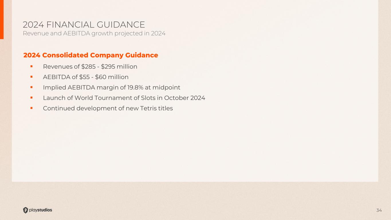 33 2Q24 Financial Metrics  Revenues: $72.6 million  Net loss (GAAP) of $2.6 million  AEBITDA: $14.1 million  AEBITDA Margin: 19.5%  Cash Balance: $106 million  No outstanding borrowings under Credit Facility Game Metrics  Portfolio of 20 Games  3.2 million Average DAU  13.6 million Average MAU 2Q24 FINANCIAL RESULTS