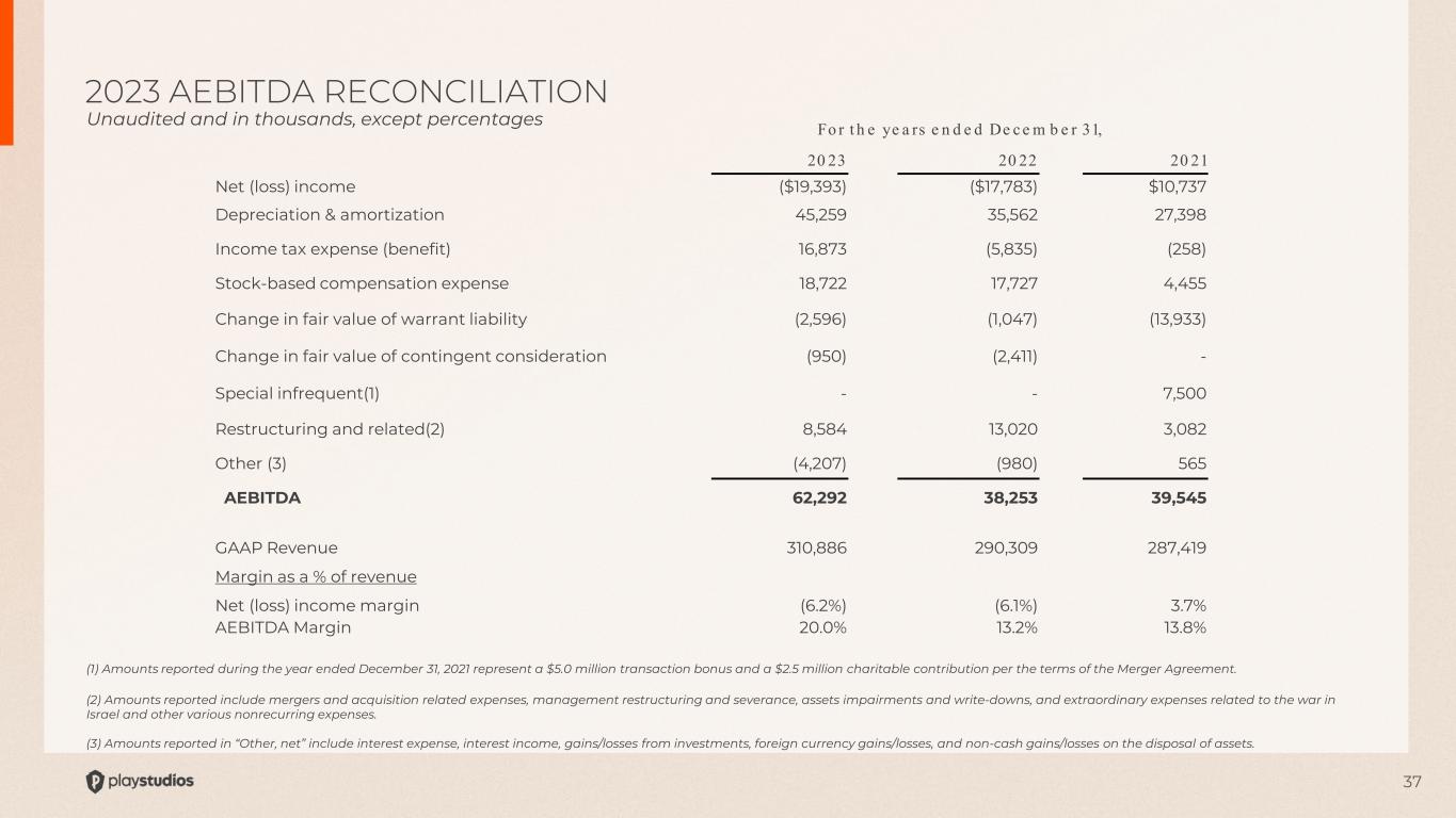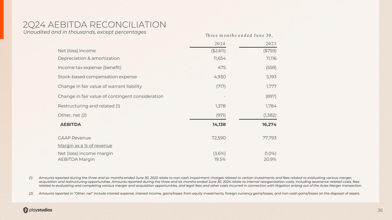 36 (1) Amounts reported during the three and six months ended June 30, 2023 relate to non-cash impairment charges related to certain investments and fees related to evaluating various merger, acquisition and restructuring opportunities. Amounts reported during the three and six months ended June 30, 2024 relate to internal reorganization costs, including severance-related costs, fees related to evaluating and completing various merger and acquisition opportunities, and legal fees and other costs incurred in connection with litigation arising out of the Acies Merger transaction. (2) Amounts reported in “Other, net” include interest expense, interest income, gains/losses from equity investments, foreign currency gains/losses, and non-cash gains/losses on the disposal of assets. 2Q24 AEBITDA RECONCILIATION Unaudited and in thousands, except percentages Th re e m o n t h s e n d e d J u n e 30 , 20 24 20 23 Net (loss) income ($2,611) ($759) Depreciation & amortization 11,654 11,116 Income tax expense (benefit) 475 (558) Stock-based compensation expense 4,930 5,193 Change in fair value of warrant liability (717) 1,777 Change in fair value of contingent consideration - (897) Restructuring and related (1) 1,378 1,784 Other, net (2) (971) (1,382) AEBITDA 14,138 16,274 GAAP Revenue 72,590 77,793 Margin as a % of revenue Net (loss) income margin (3.6%) (1.0%) AEBITDA Margin 19.5% 20.9%