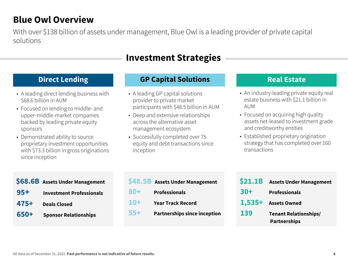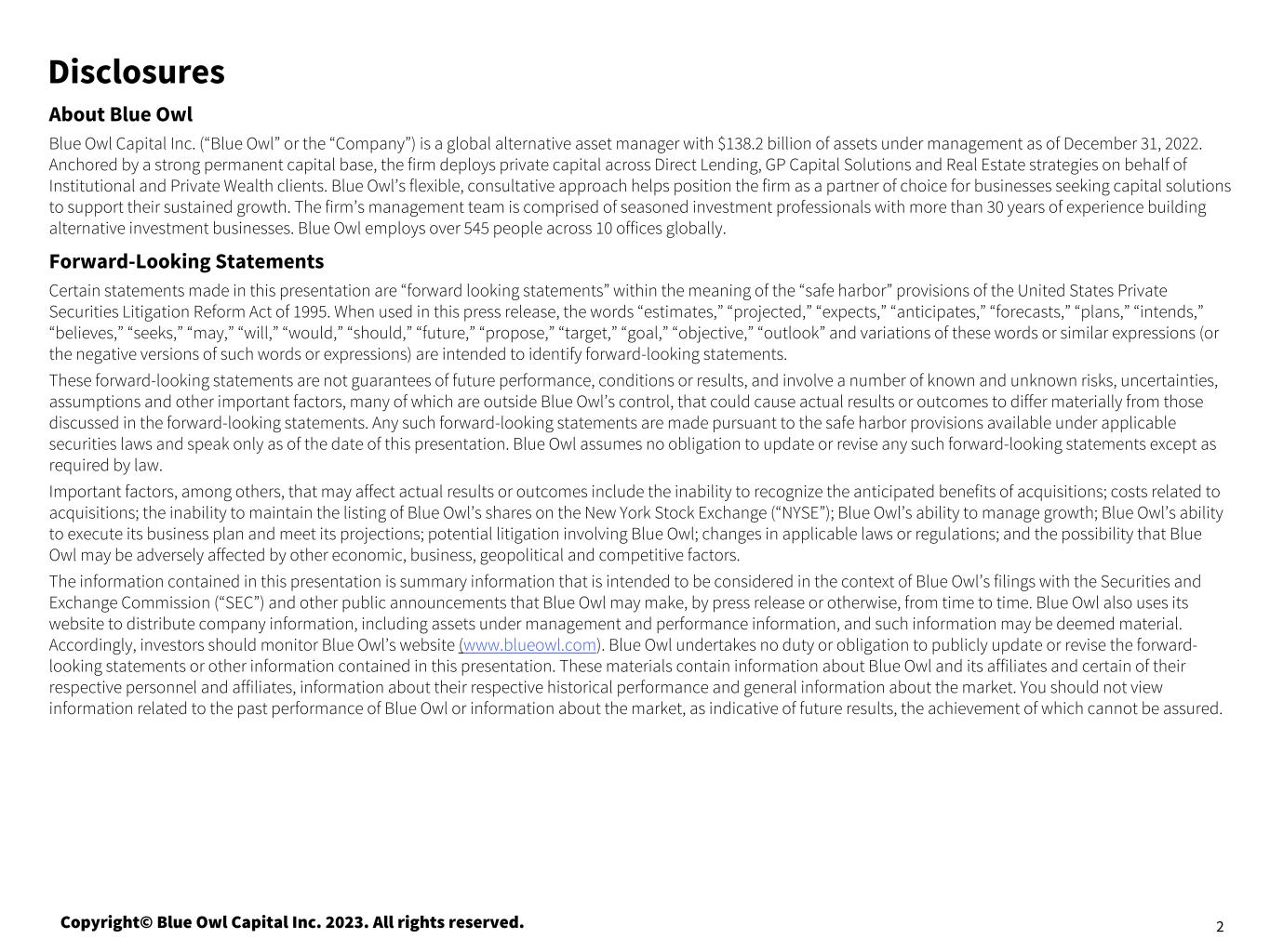 2 About Blue Owl Blue Owl Capital Inc. (“Blue Owl” or the “Company”) is a global alternative asset manager with $138.2 billion of assets under management as of December 31, 2022. Anchored by a strong permanent capital base, the firm deploys private capital across Direct Lending, GP Capital Solutions and Real Estate strategies on behalf of Institutional and Private Wealth clients. Blue Owl’s flexible, consultative approach helps position the firm as a partner of choice for businesses seeking capital solutions to support their sustained growth. The firm’s management team is comprised of seasoned investment professionals with more than 30 years of experience building alternative investment businesses. Blue Owl employs over 545 people across 10 offices globally. Forward-Looking Statements Certain statements made in this presentation are “forward looking statements” within the meaning of the “safe harbor” provisions of the United States Private Securities Litigation Reform Act of 1995. When used in this press release, the words “estimates,” “projected,” “expects,” “anticipates,” “forecasts,” “plans,” “intends,” “believes,” “seeks,” “may,” “will,” “would,” “should,” “future,” “propose,” “target,” “goal,” “objective,” “outlook” and variations of these words or similar expressions (or the negative versions of such words or expressions) are intended to identify forward-looking statements. These forward-looking statements are not guarantees of future performance, conditions or results, and involve a number of known and unknown risks, uncertainties, assumptions and other important factors, many of which are outside Blue Owl’s control, that could cause actual results or outcomes to differ materially from those discussed in the forward-looking statements. Any such forward-looking statements are made pursuant to the safe harbor provisions available under applicable securities laws and speak only as of the date of this presentation. Blue Owl assumes no obligation to update or revise any such forward-looking statements except as required by law. Important factors, among others, that may affect actual results or outcomes include the inability to recognize the anticipated benefits of acquisitions; costs related to acquisitions; the inability to maintain the listing of Blue Owl’s shares on the New York Stock Exchange (“NYSE”); Blue Owl’s ability to manage growth; Blue Owl’s ability to execute its business plan and meet its projections; potential litigation involving Blue Owl; changes in applicable laws or regulations; and the possibility that Blue Owl may be adversely affected by other economic, business, geopolitical and competitive factors. The information contained in this presentation is summary information that is intended to be considered in the context of Blue Owl’s filings with the Securities and Exchange Commission (“SEC”) and other public announcements that Blue Owl may make, by press release or otherwise, from time to time. Blue Owl also uses its website to distribute company information, including assets under management and performance information, and such information may be deemed material. Accordingly, investors should monitor Blue Owl’s website (www.blueowl.com). Blue Owl undertakes no duty or obligation to publicly update or revise the forward- looking statements or other information contained in this presentation. These materials contain information about Blue Owl and its affiliates and certain of their respective personnel and affiliates, information about their respective historical performance and general information about the market. You should not view information related to the past performance of Blue Owl or information about the market, as indicative of future results, the achievement of which cannot be assured. Disclosures Copyright© Blue Owl Capital Inc. 2023. All rights reserved.