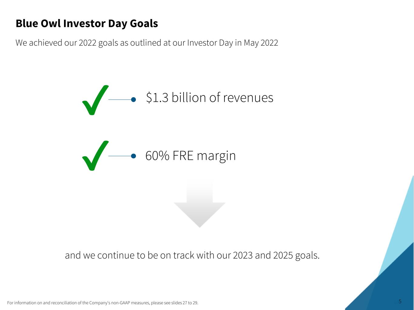 5 Blue Owl Investor Day Goals We achieved our 2022 goals as outlined at our Investor Day in May 2022 $1.3 billion of revenues 60% FRE margin For information on and reconciliation of the Company's non-GAAP measures, please see slides 27 to 29. 5 and we continue to be on track with our 2023 and 2025 goals.
