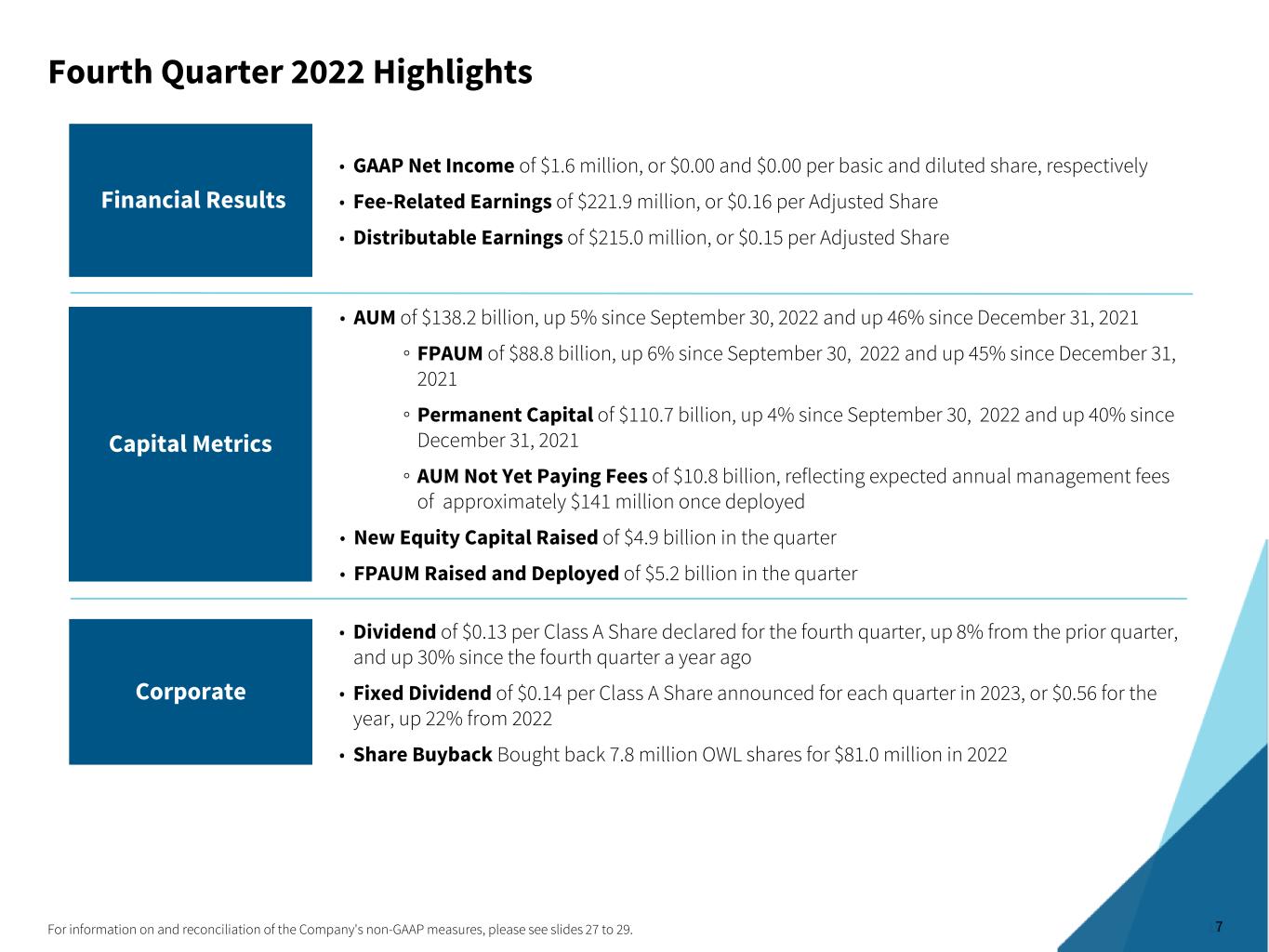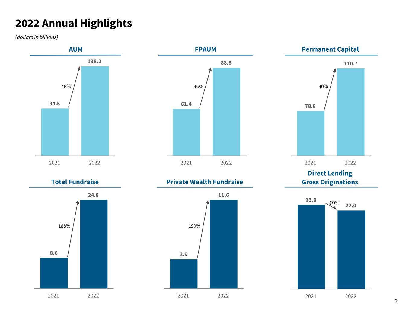 6 23.6 22.0 2021 2022 2022 Annual Highlights 94.5 138.2 2021 2022 61.4 88.8 2021 2022 3.9 11.6 2021 2022 Direct Lending Gross Originations AUM FPAUM Private Wealth Fundraise 45% 46% 199% 78.8 110.7 2021 2022 Permanent Capital 8.6 24.8 2021 2022 Total Fundraise 188% 40% (7)% (dollars in billions)