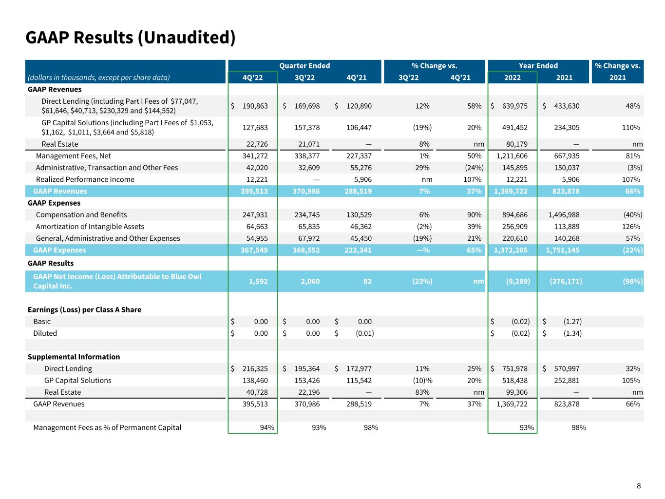 7 • Dividend of $0.13 per Class A Share declared for the fourth quarter, up 8% from the prior quarter, and up 30% since the fourth quarter a year ago • Fixed Dividend of $0.14 per Class A Share announced for each quarter in 2023, or $0.56 for the year, up 22% from 2022 • Share Buyback Bought back 7.8 million OWL shares for $81.0 million in 2022 For information on and reconciliation of the Company's non-GAAP measures, please see slides 27 to 29. Fourth Quarter 2022 Highlights Financial Results Capital Metrics Corporate • GAAP Net Income of $1.6 million, or $0.00 and $0.00 per basic and diluted share, respectively • Fee-Related Earnings of $221.9 million, or $0.16 per Adjusted Share • Distributable Earnings of $215.0 million, or $0.15 per Adjusted Share • AUM of $138.2 billion, up 5% since September 30, 2022 and up 46% since December 31, 2021 ◦ FPAUM of $88.8 billion, up 6% since September 30, 2022 and up 45% since December 31, 2021 ◦ Permanent Capital of $110.7 billion, up 4% since September 30, 2022 and up 40% since December 31, 2021 ◦ AUM Not Yet Paying Fees of $10.8 billion, reflecting expected annual management fees of approximately $141 million once deployed • New Equity Capital Raised of $4.9 billion in the quarter • FPAUM Raised and Deployed of $5.2 billion in the quarter