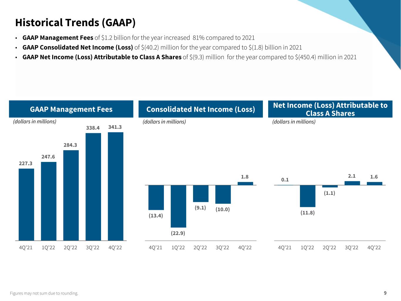 9 • GAAP Management Fees of $1.2 billion for the year increased 81% compared to 2021 • GAAP Consolidated Net Income (Loss) of $(40.2) million for the year compared to $(1.8) billion in 2021 • GAAP Net Income (Loss) Attributable to Class A Shares of $(9.3) million for the year compared to $(450.4) million in 2021 GAAP Management Fees Net Income (Loss) Attributable to Class A Shares (dollars in millions) Consolidated Net Income (Loss) Historical Trends (GAAP) (dollars in millions) (dollars in millions) 227.3 247.6 284.3 338.4 341.3 4Q'21 1Q'22 2Q'22 3Q'22 4Q'22 0.1 (11.8) (1.1) 2.1 1.6 4Q'21 1Q'22 2Q'22 3Q'22 4Q'22 (13.4) (22.9) (9.1) (10.0) 1.8 4Q'21 1Q'22 2Q'22 3Q'22 4Q'22 Figures may not sum due to rounding.