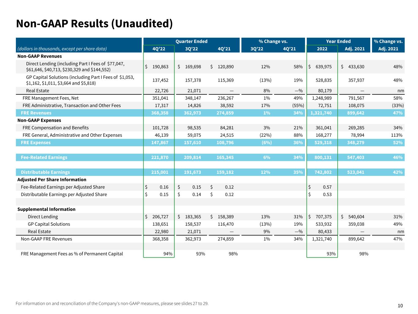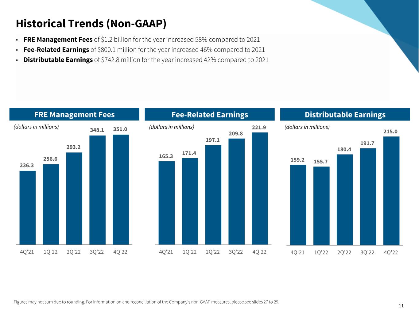 10For information on and reconciliation of the Company's non-GAAP measures, please see slides 27 to 29. Non-GAAP Results (Unaudited) Quarter Ended % Change vs. Year Ended % Change vs. (dollars in thousands, except per share data) 4Q'22 3Q'22 4Q'21 3Q'22 4Q'21 2022 Adj. 2021 Adj. 2021 Non-GAAP Revenues Direct Lending (including Part I Fees of $77,047, $61,646, $40,713, $230,329 and $144,552) $ 190,863 $ 169,698 $ 120,890 12% 58% $ 639,975 $ 433,630 48% GP Capital Solutions (including Part I Fees of $1,053, $1,162, $1,011, $3,664 and $5,818) 137,452 157,378 115,369 (13%) 19% 528,835 357,937 48% Real Estate 22,726 21,071 — 8% —% 80,179 — nm FRE Management Fees, Net 351,041 348,147 236,267 1% 49% 1,248,989 791,567 58% FRE Administrative, Transaction and Other Fees 17,317 14,826 38,592 17% (55%) 72,751 108,075 (33%) FRE Revenues 368,358 362,973 274,859 1% 34% 1,321,740 899,642 47% Non-GAAP Expenses FRE Compensation and Benefits 101,728 98,535 84,281 3% 21% 361,041 269,285 34% FRE General, Administrative and Other Expenses 46,139 59,075 24,515 (22%) 88% 168,277 78,994 113% FRE Expenses 147,867 157,610 108,796 (6%) 36% 529,318 348,279 52% Fee-Related Earnings 221,870 209,814 165,345 6% 34% 800,131 547,403 46% Distributable Earnings 215,001 191,673 159,182 12% 35% 742,802 523,041 42% Adjusted Per Share Information Fee-Related Earnings per Adjusted Share $ 0.16 $ 0.15 $ 0.12 $ 0.57 Distributable Earnings per Adjusted Share $ 0.15 $ 0.14 $ 0.12 $ 0.53 Supplemental Information Direct Lending $ 206,727 $ 183,365 $ 158,389 13% 31% $ 707,375 $ 540,604 31% GP Capital Solutions 138,651 158,537 116,470 (13%) 19% 533,932 359,038 49% Real Estate 22,980 21,071 — 9% —% 80,433 — nm Non-GAAP FRE Revenues 368,358 362,973 274,859 1% 34% 1,321,740 899,642 47% FRE Management Fees as % of Permanent Capital 94% 93% 98% 93% 98%