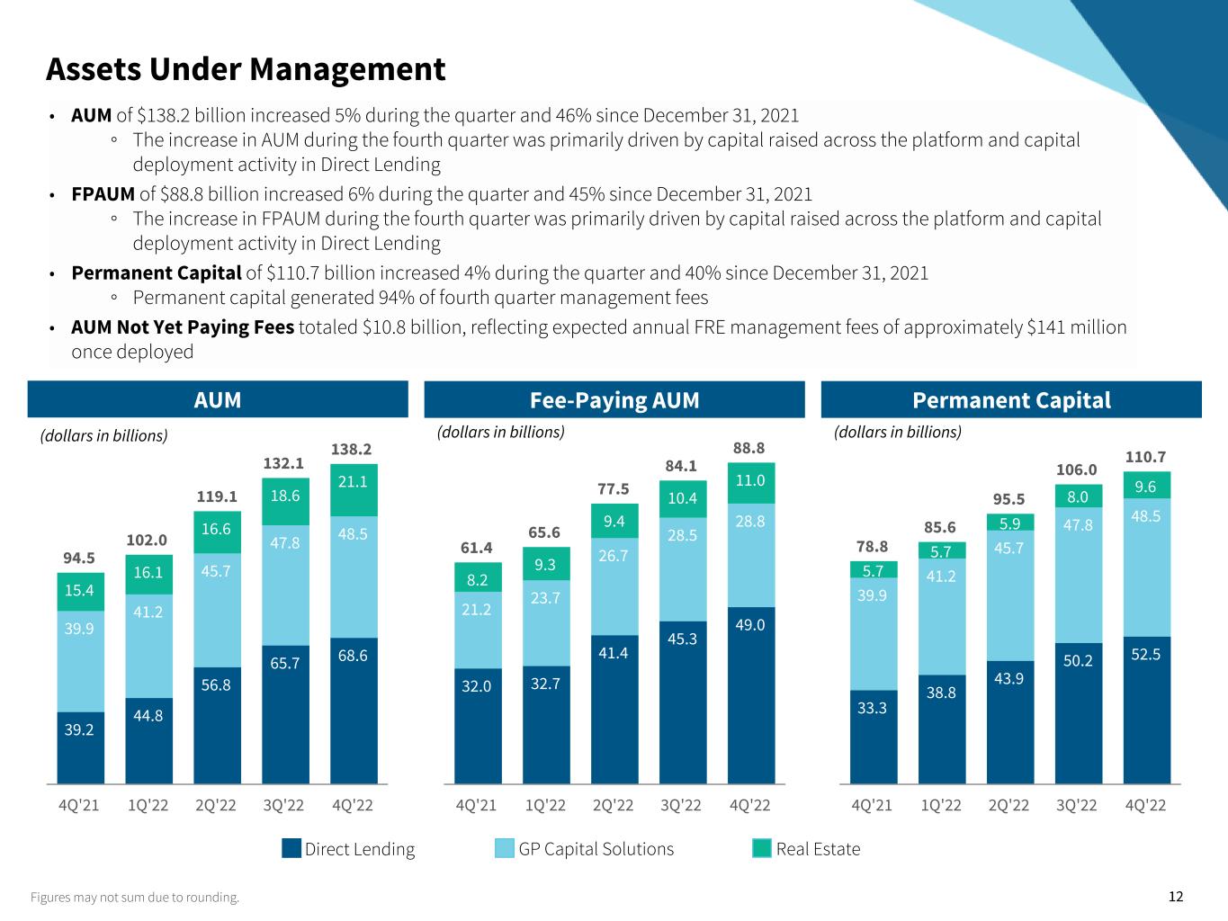 11 • FRE Management Fees of $1.2 billion for the year increased 58% compared to 2021 • Fee-Related Earnings of $800.1 million for the year increased 46% compared to 2021 • Distributable Earnings of $742.8 million for the year increased 42% compared to 2021 Figures may not sum due to rounding. For information on and reconciliation of the Company's non-GAAP measures, please see slides 27 to 29. FRE Management Fees Distributable Earnings (dollars in millions) 159.2 155.7 180.4 191.7 215.0 4Q'21 1Q'22 2Q'22 3Q'22 4Q'22 Fee-Related Earnings Historical Trends (Non-GAAP) (dollars in millions) (dollars in millions) 165.3 171.4 197.1 209.8 221.9 4Q'21 1Q'22 2Q'22 3Q'22 4Q'22 236.3 256.6 293.2 348.1 351.0 4Q'21 1Q'22 2Q'22 3Q'22 4Q'22