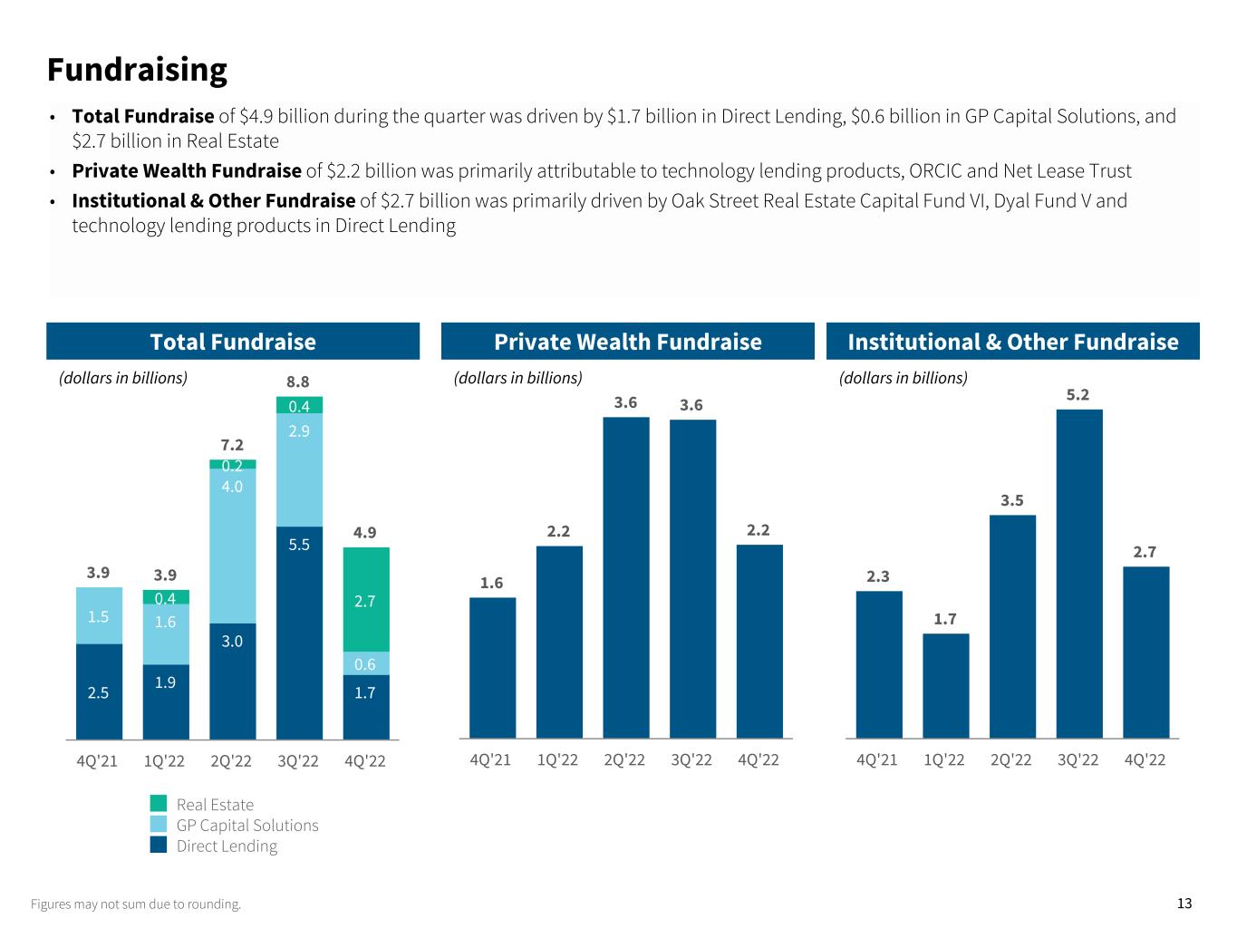 12Figures may not sum due to rounding. Assets Under Management AUM Fee-Paying AUM Permanent Capital Direct Lending GP Capital Solutions (dollars in billions) 94.5 102.0 119.1 132.1 138.2 39.2 44.8 56.8 65.7 68.6 39.9 41.2 45.7 47.8 48.5 15.4 16.1 16.6 18.6 21.1 4Q'21 1Q'22 2Q'22 3Q'22 4Q'22 61.4 65.6 77.5 84.1 88.8 32.0 32.7 41.4 45.3 49.0 21.2 23.7 26.7 28.5 28.8 8.2 9.3 9.4 10.4 11.0 4Q'21 1Q'22 2Q'22 3Q'22 4Q'22 78.8 85.6 95.5 106.0 110.7 33.3 38.8 43.9 50.2 52.5 39.9 41.2 45.7 47.8 48.5 5.7 5.7 5.9 8.0 9.6 4Q'21 1Q'22 2Q'22 3Q'22 4Q'22 Real Estate • AUM of $138.2 billion increased 5% during the quarter and 46% since December 31, 2021 ◦ The increase in AUM during the fourth quarter was primarily driven by capital raised across the platform and capital deployment activity in Direct Lending • FPAUM of $88.8 billion increased 6% during the quarter and 45% since December 31, 2021 ◦ The increase in FPAUM during the fourth quarter was primarily driven by capital raised across the platform and capital deployment activity in Direct Lending • Permanent Capital of $110.7 billion increased 4% during the quarter and 40% since December 31, 2021 ◦ Permanent capital generated 94% of fourth quarter management fees • AUM Not Yet Paying Fees totaled $10.8 billion, reflecting expected annual FRE management fees of approximately $141 million once deployed (dollars in billions) (dollars in billions)