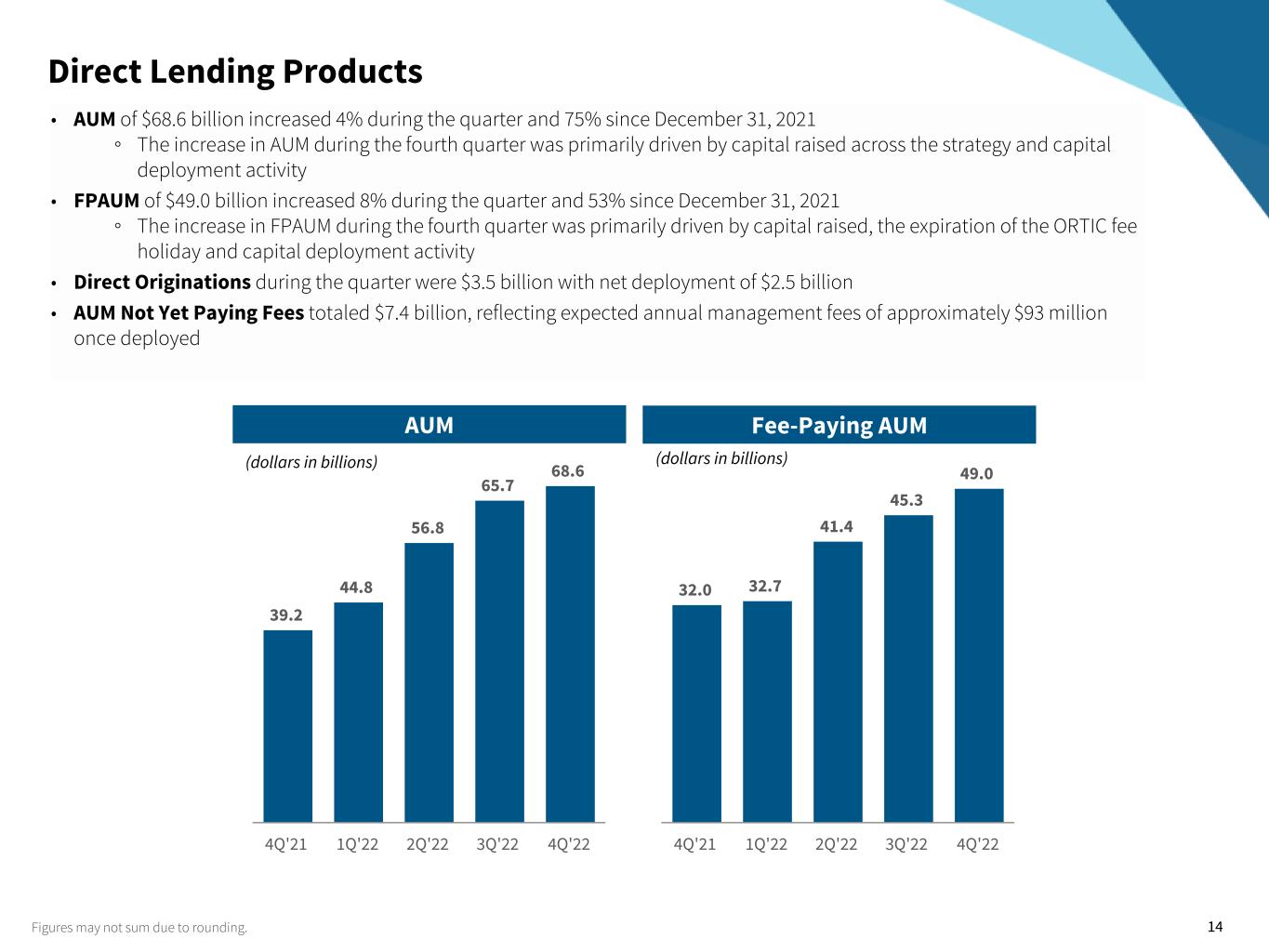 13 Total Fundraise (dollars in billions) 3.9 3.9 7.2 8.8 4.9 2.5 1.9 3.0 5.5 1.7 1.5 1.6 4.0 2.9 0.6 0.4 0.2 0.4 2.7 Real Estate GP Capital Solutions Direct Lending 4Q'21 1Q'22 2Q'22 3Q'22 4Q'22 Private Wealth Fundraise (dollars in billions) 1.6 2.2 3.6 3.6 2.2 4Q'21 1Q'22 2Q'22 3Q'22 4Q'22 Institutional & Other Fundraise (dollars in billions) 2.3 1.7 3.5 5.2 2.7 4Q'21 1Q'22 2Q'22 3Q'22 4Q'22 Fundraising • Total Fundraise of $4.9 billion during the quarter was driven by $1.7 billion in Direct Lending, $0.6 billion in GP Capital Solutions, and $2.7 billion in Real Estate • Private Wealth Fundraise of $2.2 billion was primarily attributable to technology lending products, ORCIC and Net Lease Trust • Institutional & Other Fundraise of $2.7 billion was primarily driven by Oak Street Real Estate Capital Fund VI, Dyal Fund V and technology lending products in Direct Lending Figures may not sum due to rounding.