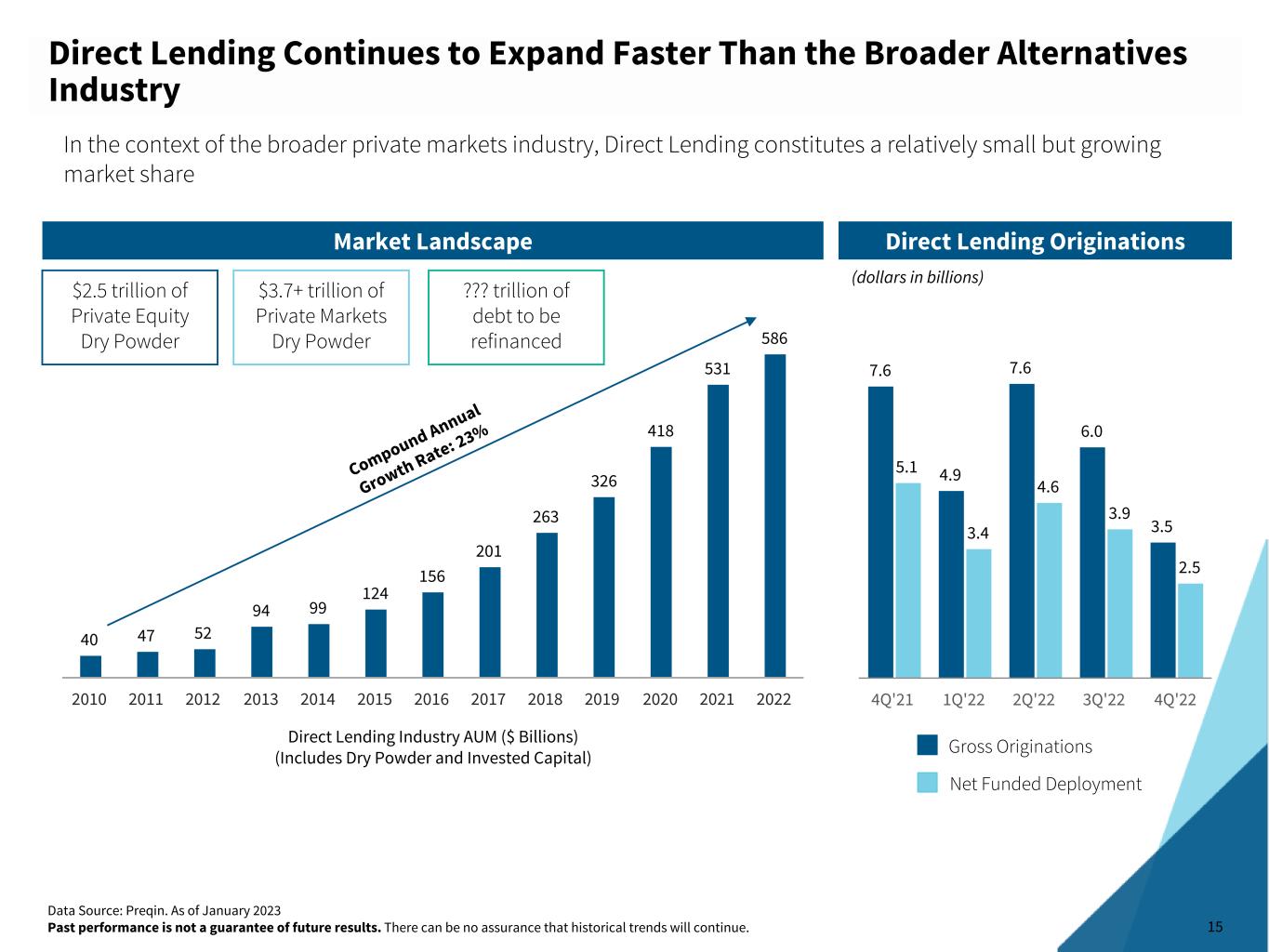 15 40 47 52 94 99 124 156 201 263 326 418 531 586 2010 2011 2012 2013 2014 2015 2016 2017 2018 2019 2020 2021 2022 Market Landscape Direct Lending Continues to Expand Faster Than the Broader Alternatives Industry (dollars in billions) 7.6 4.9 7.6 6.0 3.5 5.1 3.4 4.6 3.9 2.5 4Q'21 1Q'22 2Q'22 3Q'22 4Q'22 $2.5 trillion of Private Equity Dry Powder $3.7+ trillion of Private Markets Dry Powder ??? trillion of debt to be refinanced In the context of the broader private markets industry, Direct Lending constitutes a relatively small but growing market share Compound Annual Growth Rate: 23% Direct Lending Industry AUM ($ Billions) (Includes Dry Powder and Invested Capital) Direct Lending Originations Gross Originations Net Funded Deployment Data Source: Preqin. As of January 2023 Past performance is not a guarantee of future results. There can be no assurance that historical trends will continue.