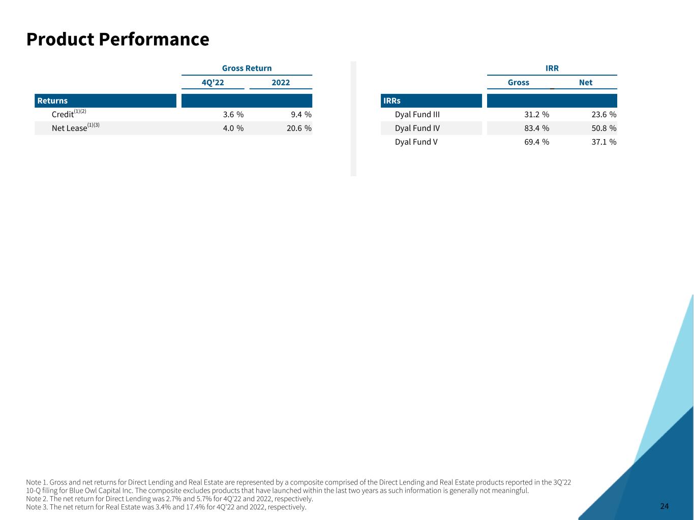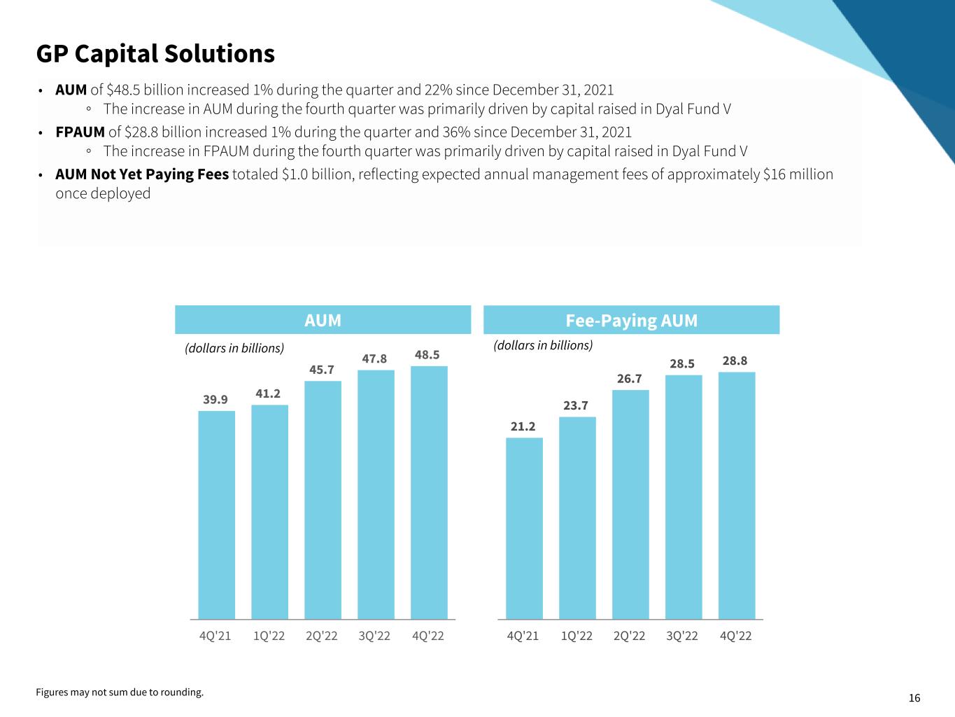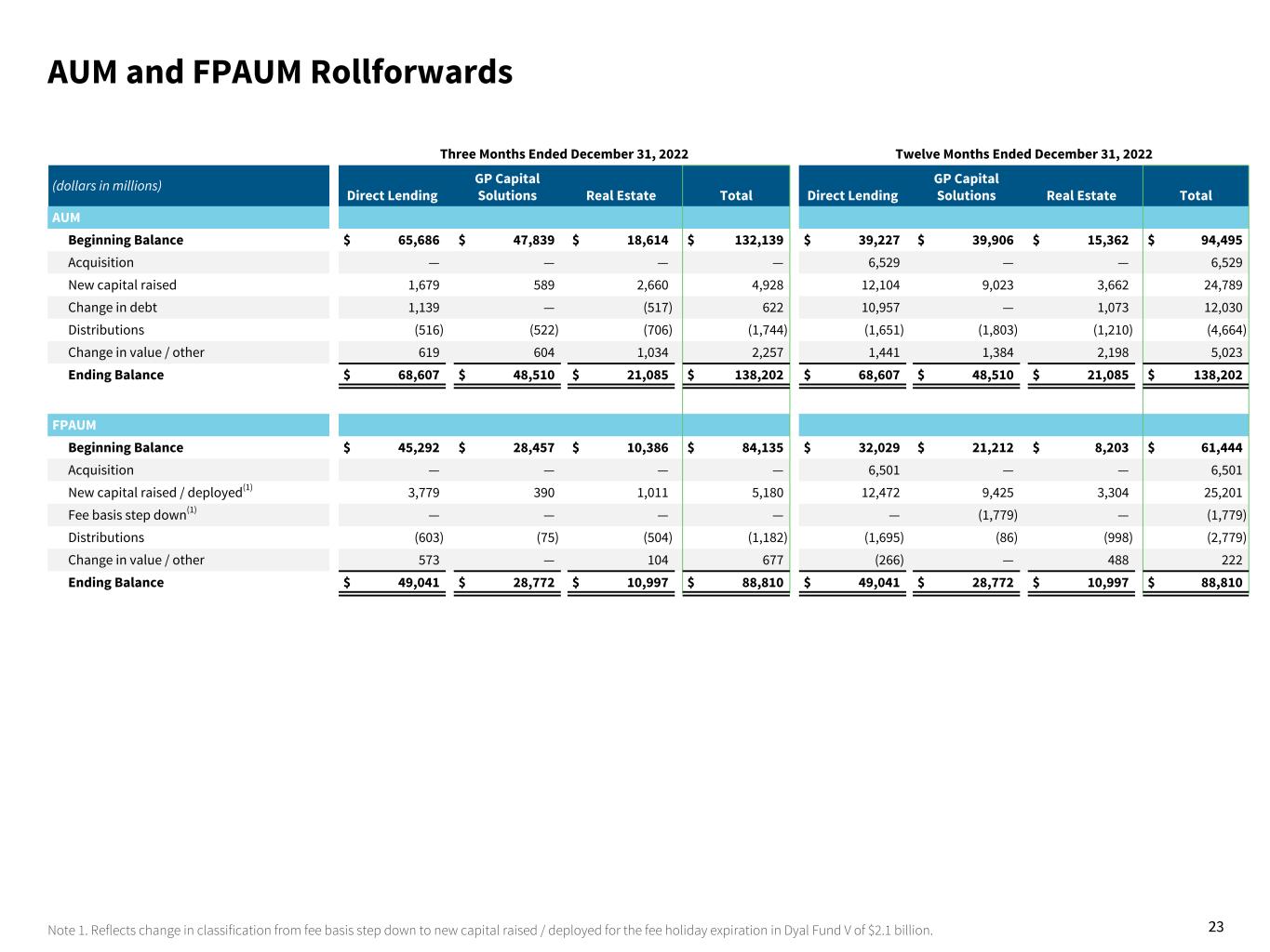 23 AUM and FPAUM Rollforwards Three Months Ended December 31, 2022 Twelve Months Ended December 31, 2022 (dollars in millions) Direct Lending GP Capital Solutions Real Estate Total Direct Lending GP Capital Solutions Real Estate Total AUM Beginning Balance $ 65,686 $ 47,839 $ 18,614 $ 132,139 $ 39,227 $ 39,906 $ 15,362 $ 94,495 Acquisition — — — — 6,529 — — 6,529 New capital raised 1,679 589 2,660 4,928 12,104 9,023 3,662 24,789 Change in debt 1,139 — (517) 622 10,957 — 1,073 12,030 Distributions (516) (522) (706) (1,744) (1,651) (1,803) (1,210) (4,664) Change in value / other 619 604 1,034 2,257 1,441 1,384 2,198 5,023 Ending Balance $ 68,607 $ 48,510 $ 21,085 $ 138,202 $ 68,607 $ 48,510 $ 21,085 $ 138,202 FPAUM Beginning Balance $ 45,292 $ 28,457 $ 10,386 $ 84,135 $ 32,029 $ 21,212 $ 8,203 $ 61,444 Acquisition — — — — 6,501 — — 6,501 New capital raised / deployed(1) 3,779 390 1,011 5,180 12,472 9,425 3,304 25,201 Fee basis step down(1) — — — — — (1,779) — (1,779) Distributions (603) (75) (504) (1,182) (1,695) (86) (998) (2,779) Change in value / other 573 — 104 677 (266) — 488 222 Ending Balance $ 49,041 $ 28,772 $ 10,997 $ 88,810 $ 49,041 $ 28,772 $ 10,997 $ 88,810 Note 1. Reflects change in classification from fee basis step down to new capital raised / deployed for the fee holiday expiration in Dyal Fund V of $2.1 billion.