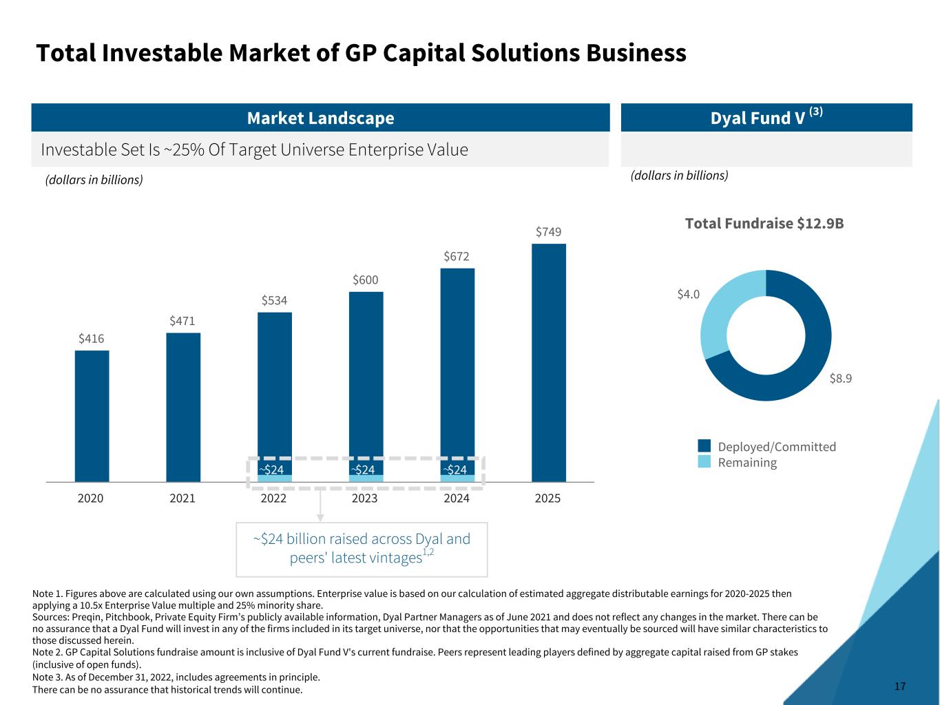 16 GP Capital Solutions AUM Fee-Paying AUM (dollars in billions) 39.9 41.2 45.7 47.8 48.5 4Q'21 1Q'22 2Q'22 3Q'22 4Q'22 21.2 23.7 26.7 28.5 28.8 4Q'21 1Q'22 2Q'22 3Q'22 4Q'22 (dollars in billions) • AUM of $48.5 billion increased 1% during the quarter and 22% since December 31, 2021 ◦ The increase in AUM during the fourth quarter was primarily driven by capital raised in Dyal Fund V • FPAUM of $28.8 billion increased 1% during the quarter and 36% since December 31, 2021 ◦ The increase in FPAUM during the fourth quarter was primarily driven by capital raised in Dyal Fund V • AUM Not Yet Paying Fees totaled $1.0 billion, reflecting expected annual management fees of approximately $16 million once deployed ~ Figures may not sum due to rounding.