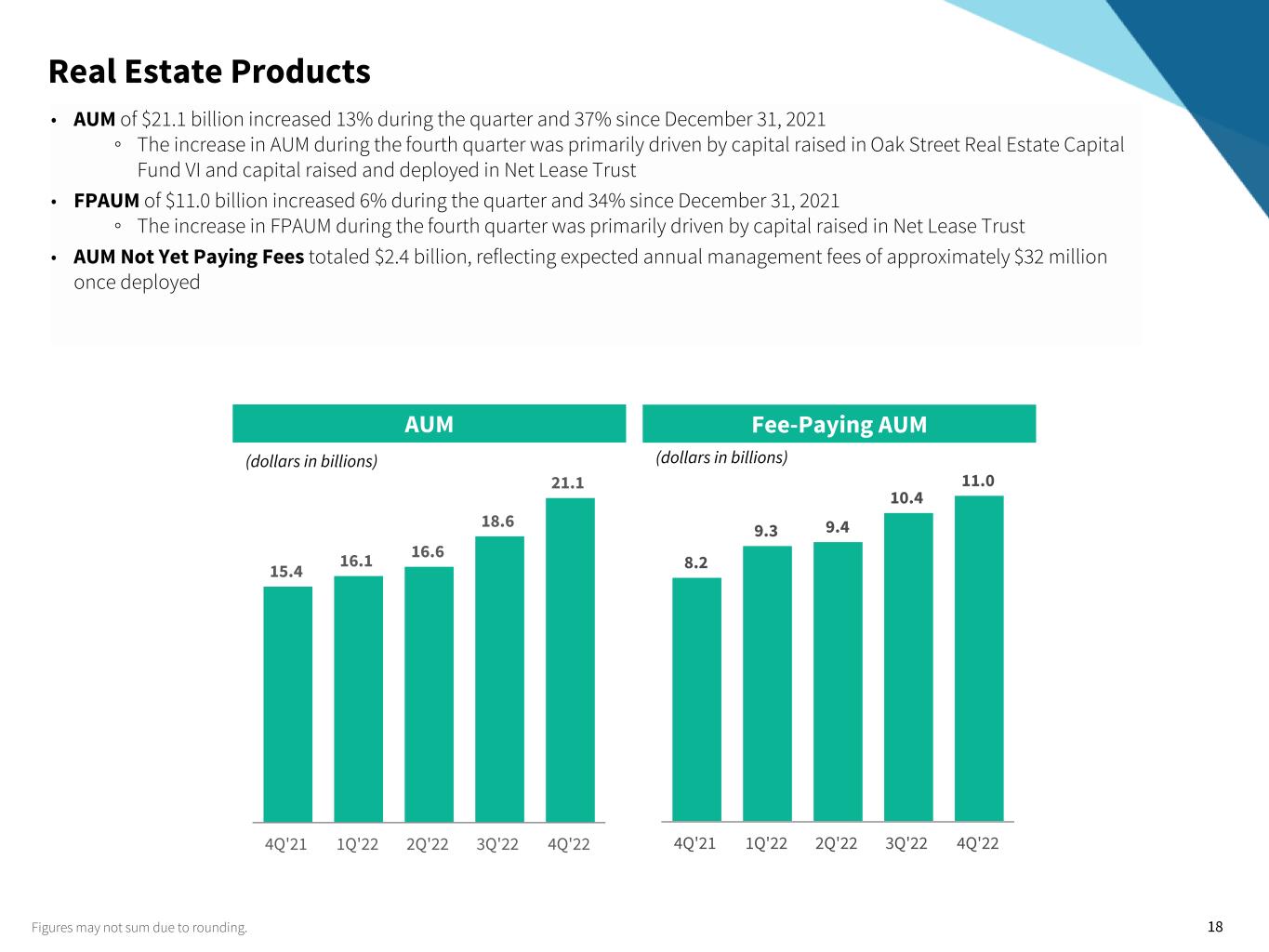 18Figures may not sum due to rounding. Real Estate Products AUM Fee-Paying AUM (dollars in billions) 15.4 16.1 16.6 18.6 21.1 4Q'21 1Q'22 2Q'22 3Q'22 4Q'22 8.2 9.3 9.4 10.4 11.0 4Q'21 1Q'22 2Q'22 3Q'22 4Q'22 (dollars in billions) • AUM of $21.1 billion increased 13% during the quarter and 37% since December 31, 2021 ◦ The increase in AUM during the fourth quarter was primarily driven by capital raised in Oak Street Real Estate Capital Fund VI and capital raised and deployed in Net Lease Trust • FPAUM of $11.0 billion increased 6% during the quarter and 34% since December 31, 2021 ◦ The increase in FPAUM during the fourth quarter was primarily driven by capital raised in Net Lease Trust • AUM Not Yet Paying Fees totaled $2.4 billion, reflecting expected annual management fees of approximately $32 million once deployed