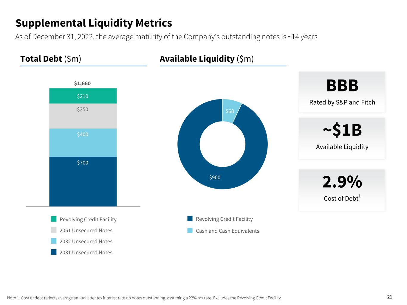 21 BBB Rated by S&P and Fitch ~$1B Available Liquidity Total Debt ($m) Available Liquidity ($m) Supplemental Liquidity Metrics $1,660 $700 $400 $350 $210 Revolving Credit Facility 2051 Unsecured Notes 2032 Unsecured Notes 2031 Unsecured Notes $68 $900 Revolving Credit Facility Cash and Cash Equivalents As of December 31, 2022, the average maturity of the Company's outstanding notes is ~14 years 2.9% Cost of Debt1 Note 1. Cost of debt reflects average annual after tax interest rate on notes outstanding, assuming a 22% tax rate. Excludes the Revolving Credit Facility.