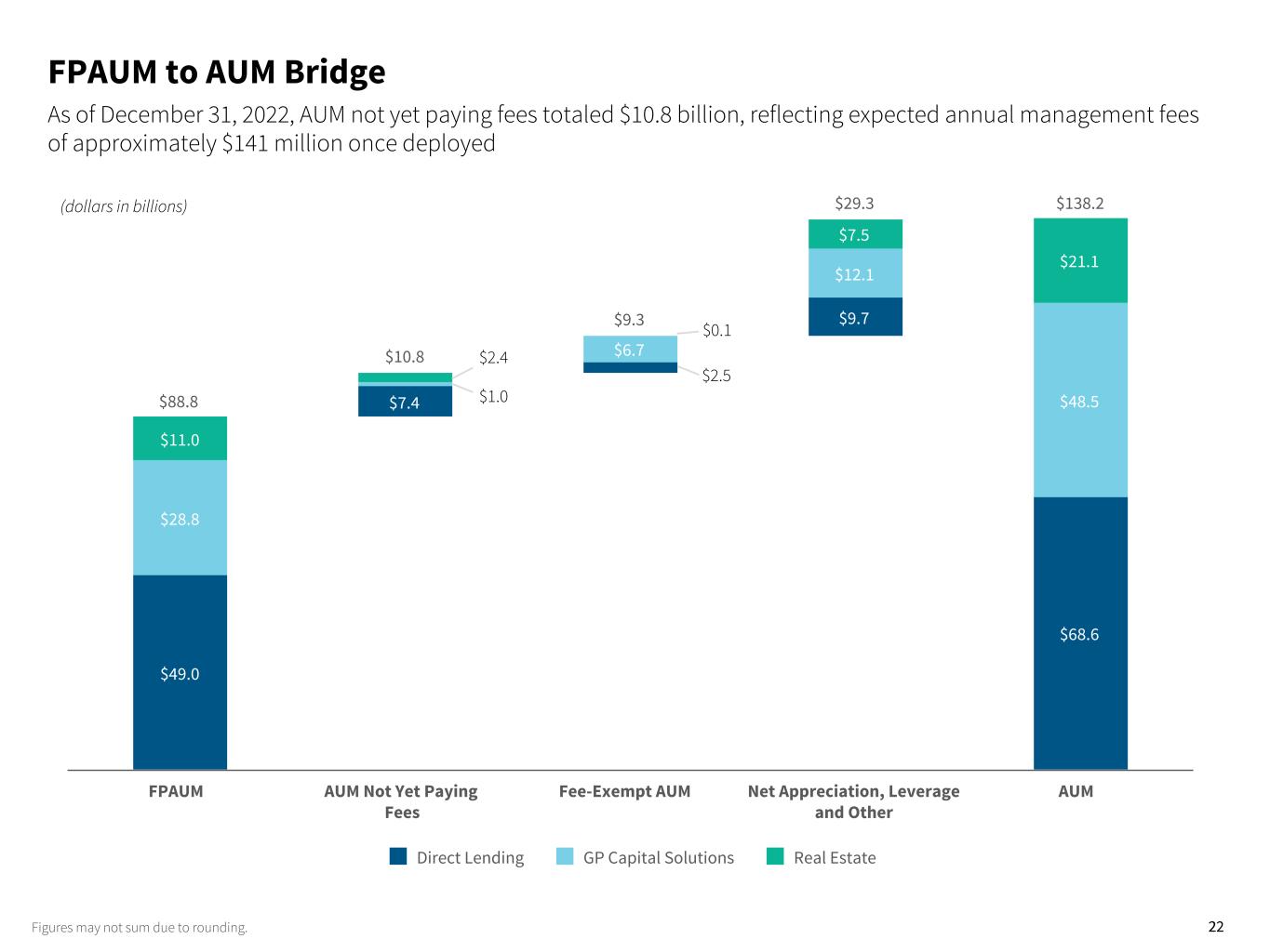 22 $88.8 $138.2 $88.8 $99.6 $108.9 $49.0 $7.4 $9.7 $68.6 $28.8 $6.7 $12.1 $48.5 $11.0 $7.5 $21.1 $10.8 $9.3 $29.3 Direct Lending GP Capital Solutions Real Estate FPAUM AUM Not Yet Paying Fees Fee-Exempt AUM Net Appreciation, Leverage and Other AUM FPAUM to AUM Bridge As of December 31, 2022, AUM not yet paying fees totaled $10.8 billion, reflecting expected annual management fees of approximately $141 million once deployed (dollars in billions) $2.4 $1.0 $0.1 $2.5 Figures may not sum due to rounding.