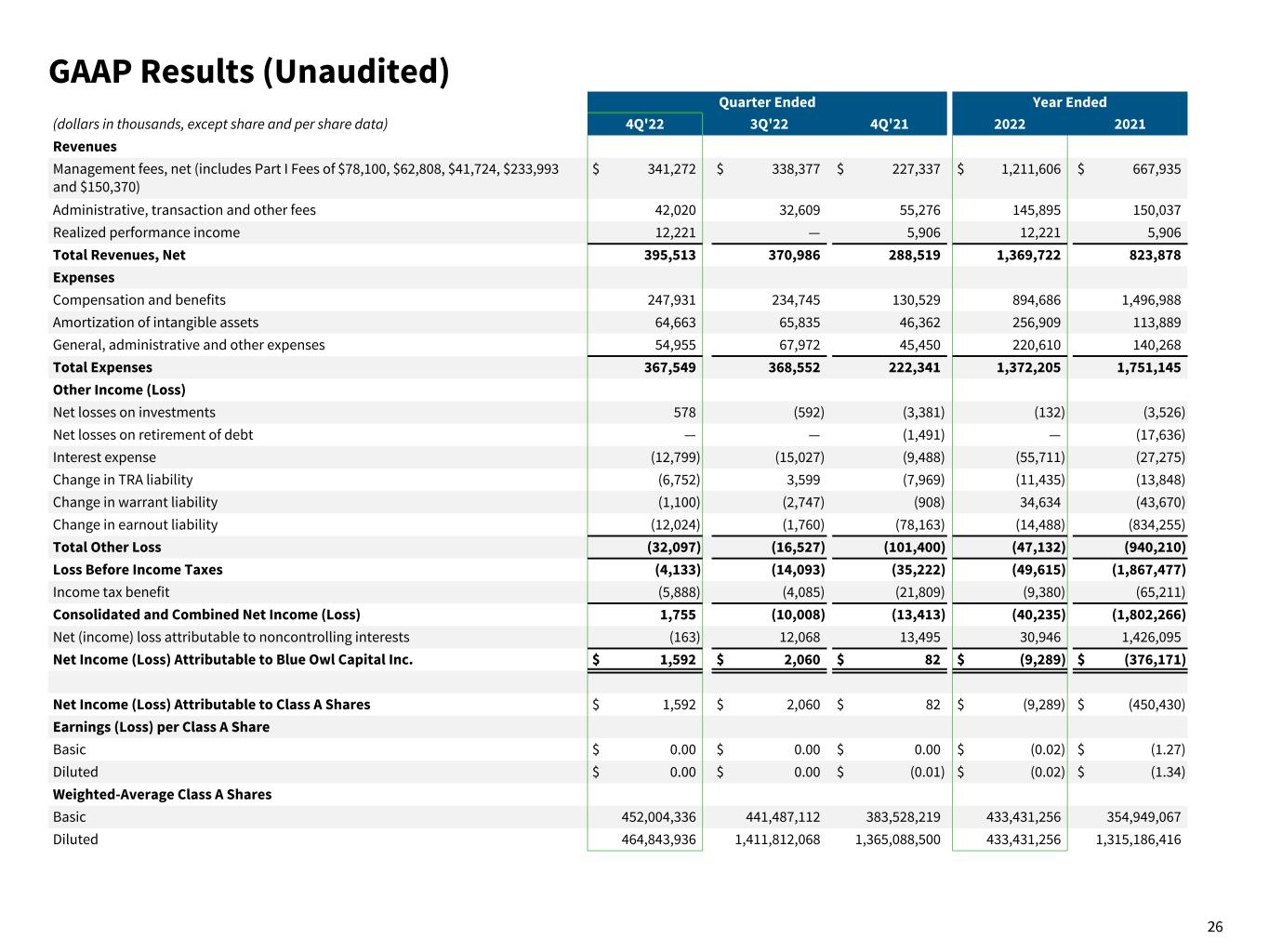 26 Quarter Ended Year Ended (dollars in thousands, except share and per share data) 4Q'22 3Q'22 4Q'21 2022 2021 Revenues Management fees, net (includes Part I Fees of $78,100, $62,808, $41,724, $233,993 and $150,370) $ 341,272 $ 338,377 $ 227,337 $ 1,211,606 $ 667,935 Administrative, transaction and other fees 42,020 32,609 55,276 145,895 150,037 Realized performance income 12,221 — 5,906 12,221 5,906 Total Revenues, Net 395,513 370,986 288,519 1,369,722 823,878 Expenses Compensation and benefits 247,931 234,745 130,529 894,686 1,496,988 Amortization of intangible assets 64,663 65,835 46,362 256,909 113,889 General, administrative and other expenses 54,955 67,972 45,450 220,610 140,268 Total Expenses 367,549 368,552 222,341 1,372,205 1,751,145 Other Income (Loss) Net losses on investments 578 (592) (3,381) (132) (3,526) Net losses on retirement of debt — — (1,491) — (17,636) Interest expense (12,799) (15,027) (9,488) (55,711) (27,275) Change in TRA liability (6,752) 3,599 (7,969) (11,435) (13,848) Change in warrant liability (1,100) (2,747) (908) 34,634 (43,670) Change in earnout liability (12,024) (1,760) (78,163) (14,488) (834,255) Total Other Loss (32,097) (16,527) (101,400) (47,132) (940,210) Loss Before Income Taxes (4,133) (14,093) (35,222) (49,615) (1,867,477) Income tax benefit (5,888) (4,085) (21,809) (9,380) (65,211) Consolidated and Combined Net Income (Loss) 1,755 (10,008) (13,413) (40,235) (1,802,266) Net (income) loss attributable to noncontrolling interests (163) 12,068 13,495 30,946 1,426,095 Net Income (Loss) Attributable to Blue Owl Capital Inc. $ 1,592 $ 2,060 $ 82 $ (9,289) $ (376,171) Net Income (Loss) Attributable to Class A Shares $ 1,592 $ 2,060 $ 82 $ (9,289) $ (450,430) Earnings (Loss) per Class A Share Basic $ 0.00 $ 0.00 $ 0.00 $ (0.02) $ (1.27) Diluted $ 0.00 $ 0.00 $ (0.01) $ (0.02) $ (1.34) Weighted-Average Class A Shares Basic 452,004,336 441,487,112 383,528,219 433,431,256 354,949,067 Diluted 464,843,936 1,411,812,068 1,365,088,500 433,431,256 1,315,186,416 GAAP Results (Unaudited)