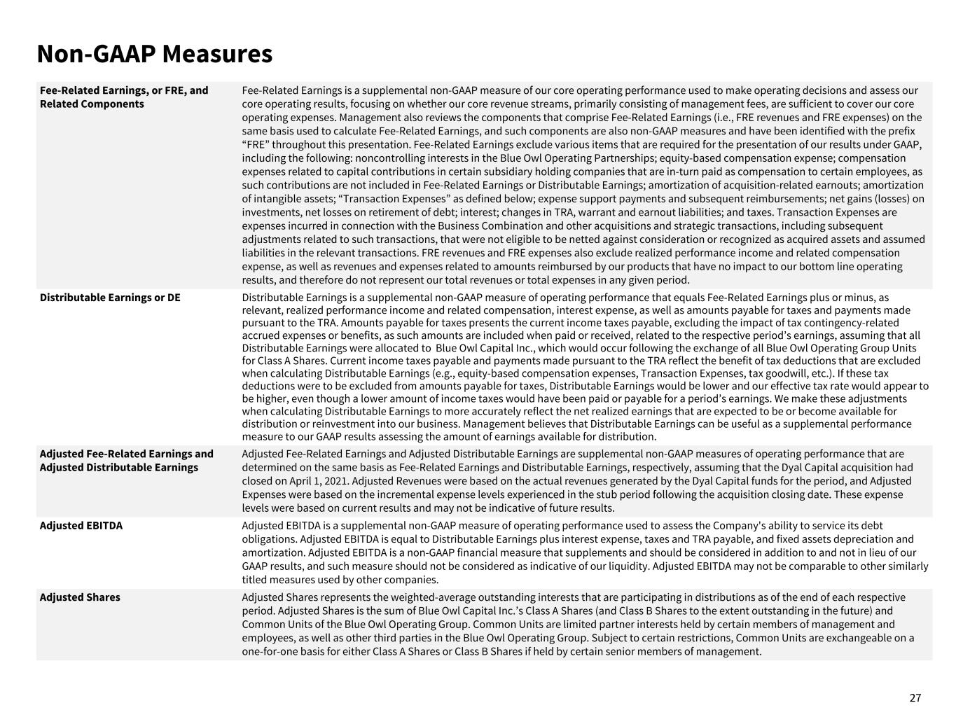 27 Non-GAAP Measures Fee-Related Earnings, or FRE, and Related Components Fee-Related Earnings is a supplemental non-GAAP measure of our core operating performance used to make operating decisions and assess our core operating results, focusing on whether our core revenue streams, primarily consisting of management fees, are sufficient to cover our core operating expenses. Management also reviews the components that comprise Fee-Related Earnings (i.e., FRE revenues and FRE expenses) on the same basis used to calculate Fee-Related Earnings, and such components are also non-GAAP measures and have been identified with the prefix “FRE” throughout this presentation. Fee-Related Earnings exclude various items that are required for the presentation of our results under GAAP, including the following: noncontrolling interests in the Blue Owl Operating Partnerships; equity-based compensation expense; compensation expenses related to capital contributions in certain subsidiary holding companies that are in-turn paid as compensation to certain employees, as such contributions are not included in Fee-Related Earnings or Distributable Earnings; amortization of acquisition-related earnouts; amortization of intangible assets; “Transaction Expenses” as defined below; expense support payments and subsequent reimbursements; net gains (losses) on investments, net losses on retirement of debt; interest; changes in TRA, warrant and earnout liabilities; and taxes. Transaction Expenses are expenses incurred in connection with the Business Combination and other acquisitions and strategic transactions, including subsequent adjustments related to such transactions, that were not eligible to be netted against consideration or recognized as acquired assets and assumed liabilities in the relevant transactions. FRE revenues and FRE expenses also exclude realized performance income and related compensation expense, as well as revenues and expenses related to amounts reimbursed by our products that have no impact to our bottom line operating results, and therefore do not represent our total revenues or total expenses in any given period. Distributable Earnings or DE Distributable Earnings is a supplemental non-GAAP measure of operating performance that equals Fee-Related Earnings plus or minus, as relevant, realized performance income and related compensation, interest expense, as well as amounts payable for taxes and payments made pursuant to the TRA. Amounts payable for taxes presents the current income taxes payable, excluding the impact of tax contingency-related accrued expenses or benefits, as such amounts are included when paid or received, related to the respective period’s earnings, assuming that all Distributable Earnings were allocated to Blue Owl Capital Inc., which would occur following the exchange of all Blue Owl Operating Group Units for Class A Shares. Current income taxes payable and payments made pursuant to the TRA reflect the benefit of tax deductions that are excluded when calculating Distributable Earnings (e.g., equity-based compensation expenses, Transaction Expenses, tax goodwill, etc.). If these tax deductions were to be excluded from amounts payable for taxes, Distributable Earnings would be lower and our effective tax rate would appear to be higher, even though a lower amount of income taxes would have been paid or payable for a period’s earnings. We make these adjustments when calculating Distributable Earnings to more accurately reflect the net realized earnings that are expected to be or become available for distribution or reinvestment into our business. Management believes that Distributable Earnings can be useful as a supplemental performance measure to our GAAP results assessing the amount of earnings available for distribution. Adjusted Fee-Related Earnings and Adjusted Distributable Earnings Adjusted Fee-Related Earnings and Adjusted Distributable Earnings are supplemental non-GAAP measures of operating performance that are determined on the same basis as Fee-Related Earnings and Distributable Earnings, respectively, assuming that the Dyal Capital acquisition had closed on April 1, 2021. Adjusted Revenues were based on the actual revenues generated by the Dyal Capital funds for the period, and Adjusted Expenses were based on the incremental expense levels experienced in the stub period following the acquisition closing date. These expense levels were based on current results and may not be indicative of future results. Adjusted EBITDA Adjusted EBITDA is a supplemental non-GAAP measure of operating performance used to assess the Company's ability to service its debt obligations. Adjusted EBITDA is equal to Distributable Earnings plus interest expense, taxes and TRA payable, and fixed assets depreciation and amortization. Adjusted EBITDA is a non-GAAP financial measure that supplements and should be considered in addition to and not in lieu of our GAAP results, and such measure should not be considered as indicative of our liquidity. Adjusted EBITDA may not be comparable to other similarly titled measures used by other companies. Adjusted Shares Adjusted Shares represents the weighted-average outstanding interests that are participating in distributions as of the end of each respective period. Adjusted Shares is the sum of Blue Owl Capital Inc.’s Class A Shares (and Class B Shares to the extent outstanding in the future) and Common Units of the Blue Owl Operating Group. Common Units are limited partner interests held by certain members of management and employees, as well as other third parties in the Blue Owl Operating Group. Subject to certain restrictions, Common Units are exchangeable on a one-for-one basis for either Class A Shares or Class B Shares if held by certain senior members of management.