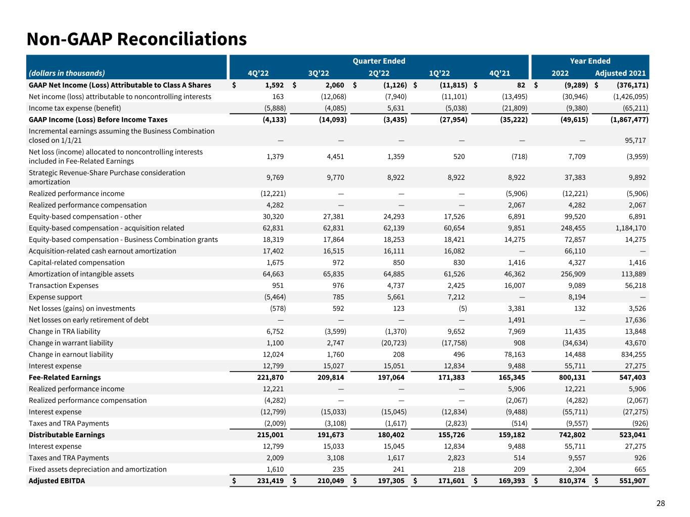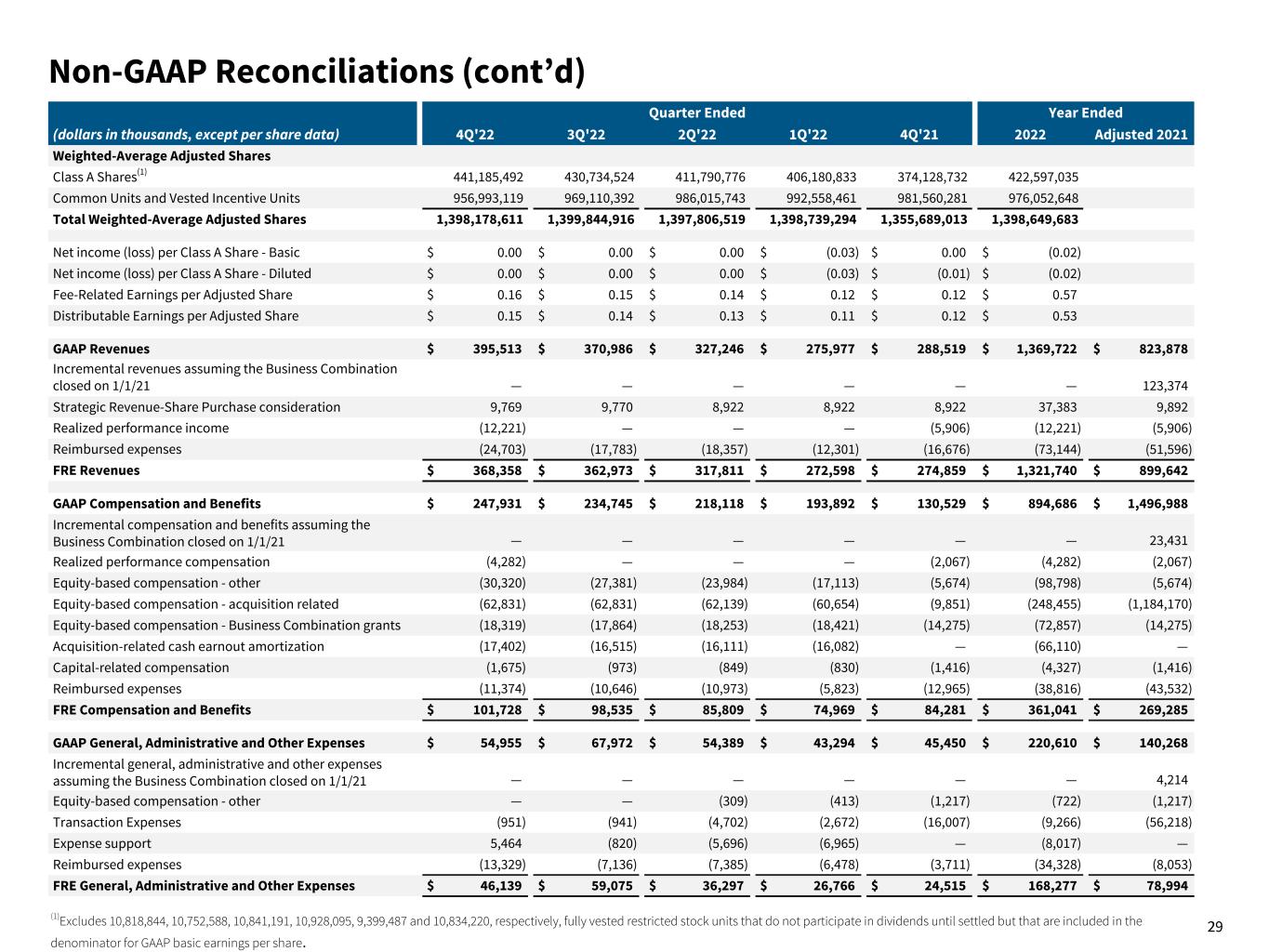 28 Quarter Ended Year Ended (dollars in thousands) 4Q'22 3Q'22 2Q'22 1Q'22 4Q'21 2022 Adjusted 2021 GAAP Net Income (Loss) Attributable to Class A Shares $ 1,592 $ 2,060 $ (1,126) $ (11,815) $ 82 $ (9,289) $ (376,171) Net income (loss) attributable to noncontrolling interests 163 (12,068) (7,940) (11,101) (13,495) (30,946) (1,426,095) Income tax expense (benefit) (5,888) (4,085) 5,631 (5,038) (21,809) (9,380) (65,211) GAAP Income (Loss) Before Income Taxes (4,133) (14,093) (3,435) (27,954) (35,222) (49,615) (1,867,477) Incremental earnings assuming the Business Combination closed on 1/1/21 — — — — — — 95,717 Net loss (income) allocated to noncontrolling interests included in Fee-Related Earnings 1,379 4,451 1,359 520 (718) 7,709 (3,959) Strategic Revenue-Share Purchase consideration amortization 9,769 9,770 8,922 8,922 8,922 37,383 9,892 Realized performance income (12,221) — — — (5,906) (12,221) (5,906) Realized performance compensation 4,282 — — — 2,067 4,282 2,067 Equity-based compensation - other 30,320 27,381 24,293 17,526 6,891 99,520 6,891 Equity-based compensation - acquisition related 62,831 62,831 62,139 60,654 9,851 248,455 1,184,170 Equity-based compensation - Business Combination grants 18,319 17,864 18,253 18,421 14,275 72,857 14,275 Acquisition-related cash earnout amortization 17,402 16,515 16,111 16,082 — 66,110 — Capital-related compensation 1,675 972 850 830 1,416 4,327 1,416 Amortization of intangible assets 64,663 65,835 64,885 61,526 46,362 256,909 113,889 Transaction Expenses 951 976 4,737 2,425 16,007 9,089 56,218 Expense support (5,464) 785 5,661 7,212 — 8,194 — Net losses (gains) on investments (578) 592 123 (5) 3,381 132 3,526 Net losses on early retirement of debt — — — — 1,491 — 17,636 Change in TRA liability 6,752 (3,599) (1,370) 9,652 7,969 11,435 13,848 Change in warrant liability 1,100 2,747 (20,723) (17,758) 908 (34,634) 43,670 Change in earnout liability 12,024 1,760 208 496 78,163 14,488 834,255 Interest expense 12,799 15,027 15,051 12,834 9,488 55,711 27,275 Fee-Related Earnings 221,870 209,814 197,064 171,383 165,345 800,131 547,403 Realized performance income 12,221 — — — 5,906 12,221 5,906 Realized performance compensation (4,282) — — — (2,067) (4,282) (2,067) Interest expense (12,799) (15,033) (15,045) (12,834) (9,488) (55,711) (27,275) Taxes and TRA Payments (2,009) (3,108) (1,617) (2,823) (514) (9,557) (926) Distributable Earnings 215,001 191,673 180,402 155,726 159,182 742,802 523,041 Interest expense 12,799 15,033 15,045 12,834 9,488 55,711 27,275 Taxes and TRA Payments 2,009 3,108 1,617 2,823 514 9,557 926 Fixed assets depreciation and amortization 1,610 235 241 218 209 2,304 665 Adjusted EBITDA $ 231,419 $ 210,049 $ 197,305 $ 171,601 $ 169,393 $ 810,374 $ 551,907 Non-GAAP Reconciliations