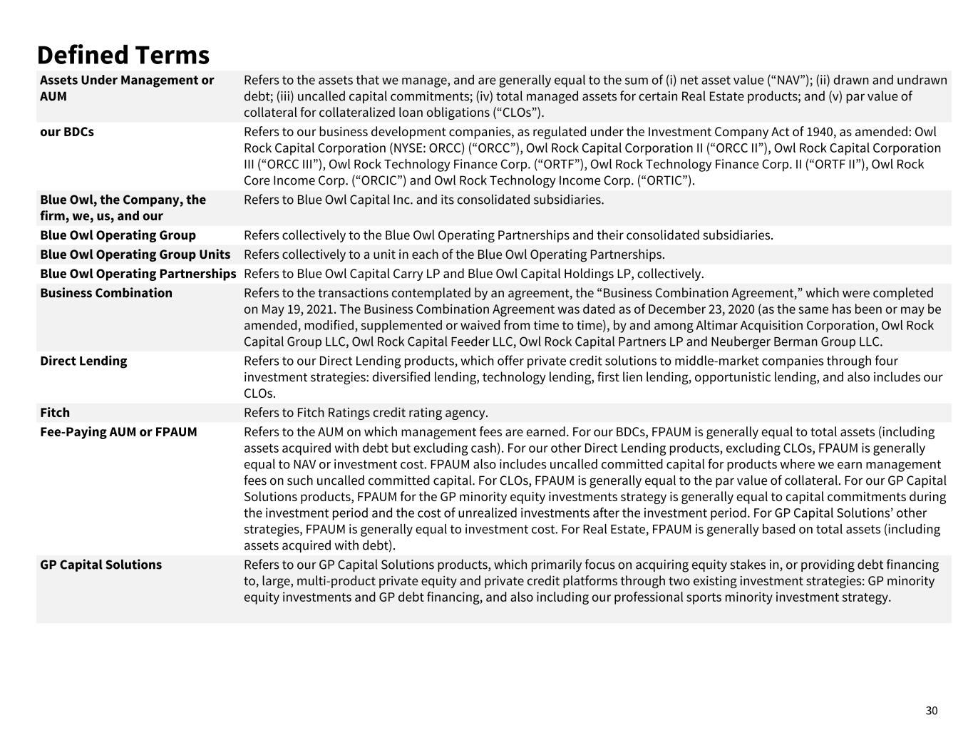 30 Assets Under Management or AUM Refers to the assets that we manage, and are generally equal to the sum of (i) net asset value (“NAV”); (ii) drawn and undrawn debt; (iii) uncalled capital commitments; (iv) total managed assets for certain Real Estate products; and (v) par value of collateral for collateralized loan obligations (“CLOs”). our BDCs Refers to our business development companies, as regulated under the Investment Company Act of 1940, as amended: Owl Rock Capital Corporation (NYSE: ORCC) (“ORCC”), Owl Rock Capital Corporation II (“ORCC II”), Owl Rock Capital Corporation III (“ORCC III”), Owl Rock Technology Finance Corp. (“ORTF”), Owl Rock Technology Finance Corp. II (“ORTF II”), Owl Rock Core Income Corp. (“ORCIC”) and Owl Rock Technology Income Corp. (“ORTIC”). Blue Owl, the Company, the firm, we, us, and our Refers to Blue Owl Capital Inc. and its consolidated subsidiaries. Blue Owl Operating Group Refers collectively to the Blue Owl Operating Partnerships and their consolidated subsidiaries. Blue Owl Operating Group Units Refers collectively to a unit in each of the Blue Owl Operating Partnerships. Blue Owl Operating Partnerships Refers to Blue Owl Capital Carry LP and Blue Owl Capital Holdings LP, collectively. Business Combination Refers to the transactions contemplated by an agreement, the “Business Combination Agreement,” which were completed on May 19, 2021. The Business Combination Agreement was dated as of December 23, 2020 (as the same has been or may be amended, modified, supplemented or waived from time to time), by and among Altimar Acquisition Corporation, Owl Rock Capital Group LLC, Owl Rock Capital Feeder LLC, Owl Rock Capital Partners LP and Neuberger Berman Group LLC. Direct Lending Refers to our Direct Lending products, which offer private credit solutions to middle-market companies through four investment strategies: diversified lending, technology lending, first lien lending, opportunistic lending, and also includes our CLOs. Fitch Refers to Fitch Ratings credit rating agency. Fee-Paying AUM or FPAUM Refers to the AUM on which management fees are earned. For our BDCs, FPAUM is generally equal to total assets (including assets acquired with debt but excluding cash). For our other Direct Lending products, excluding CLOs, FPAUM is generally equal to NAV or investment cost. FPAUM also includes uncalled committed capital for products where we earn management fees on such uncalled committed capital. For CLOs, FPAUM is generally equal to the par value of collateral. For our GP Capital Solutions products, FPAUM for the GP minority equity investments strategy is generally equal to capital commitments during the investment period and the cost of unrealized investments after the investment period. For GP Capital Solutions’ other strategies, FPAUM is generally equal to investment cost. For Real Estate, FPAUM is generally based on total assets (including assets acquired with debt). GP Capital Solutions Refers to our GP Capital Solutions products, which primarily focus on acquiring equity stakes in, or providing debt financing to, large, multi-product private equity and private credit platforms through two existing investment strategies: GP minority equity investments and GP debt financing, and also including our professional sports minority investment strategy. Defined Terms