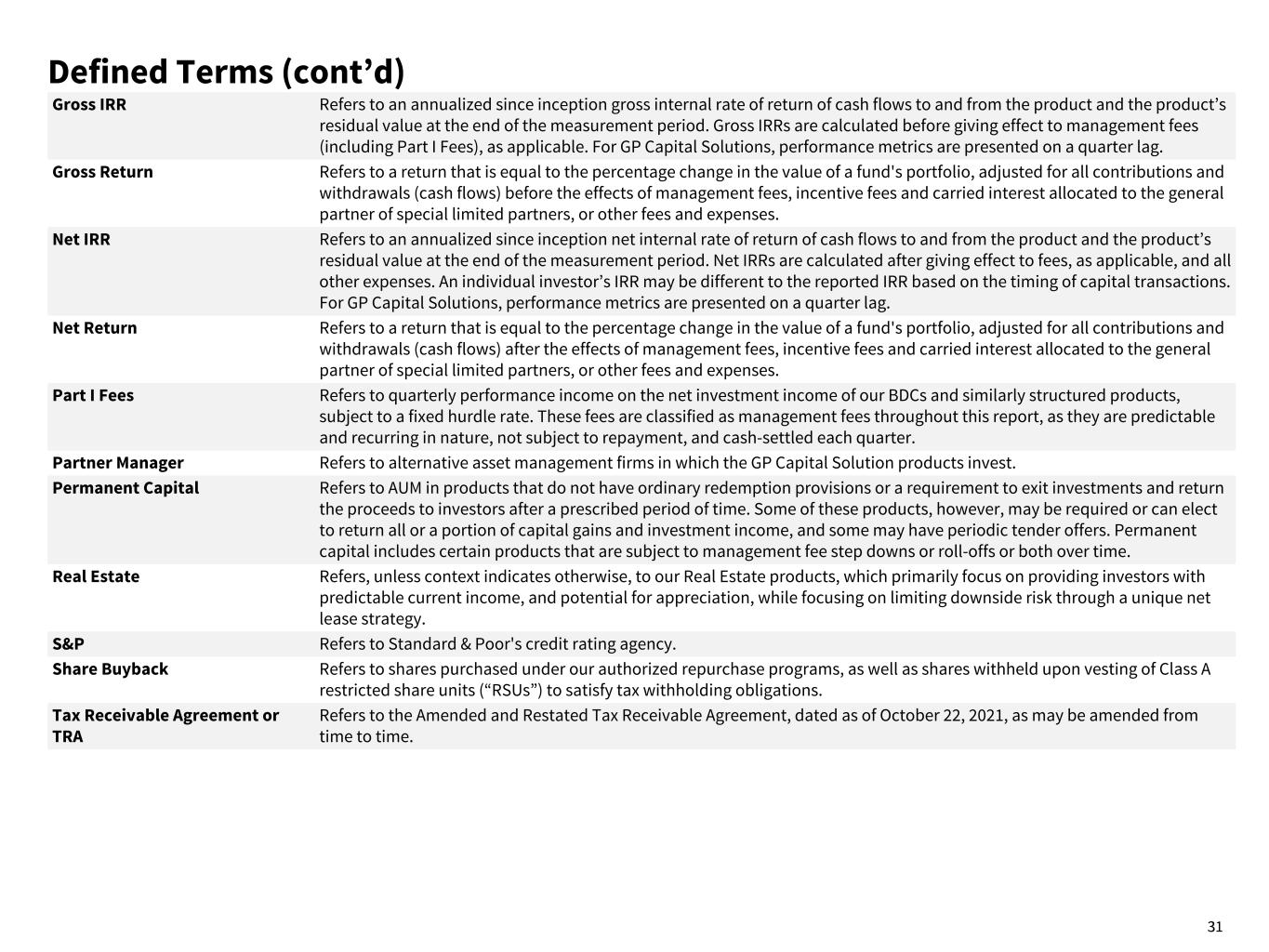 31 Defined Terms (cont’d) Gross IRR Refers to an annualized since inception gross internal rate of return of cash flows to and from the product and the product’s residual value at the end of the measurement period. Gross IRRs are calculated before giving effect to management fees (including Part I Fees), as applicable. For GP Capital Solutions, performance metrics are presented on a quarter lag. Gross Return Refers to a return that is equal to the percentage change in the value of a fund's portfolio, adjusted for all contributions and withdrawals (cash flows) before the effects of management fees, incentive fees and carried interest allocated to the general partner of special limited partners, or other fees and expenses. Net IRR Refers to an annualized since inception net internal rate of return of cash flows to and from the product and the product’s residual value at the end of the measurement period. Net IRRs are calculated after giving effect to fees, as applicable, and all other expenses. An individual investor’s IRR may be different to the reported IRR based on the timing of capital transactions. For GP Capital Solutions, performance metrics are presented on a quarter lag. Net Return Refers to a return that is equal to the percentage change in the value of a fund's portfolio, adjusted for all contributions and withdrawals (cash flows) after the effects of management fees, incentive fees and carried interest allocated to the general partner of special limited partners, or other fees and expenses. Part I Fees Refers to quarterly performance income on the net investment income of our BDCs and similarly structured products, subject to a fixed hurdle rate. These fees are classified as management fees throughout this report, as they are predictable and recurring in nature, not subject to repayment, and cash-settled each quarter. Partner Manager Refers to alternative asset management firms in which the GP Capital Solution products invest. Permanent Capital Refers to AUM in products that do not have ordinary redemption provisions or a requirement to exit investments and return the proceeds to investors after a prescribed period of time. Some of these products, however, may be required or can elect to return all or a portion of capital gains and investment income, and some may have periodic tender offers. Permanent capital includes certain products that are subject to management fee step downs or roll-offs or both over time. Real Estate Refers, unless context indicates otherwise, to our Real Estate products, which primarily focus on providing investors with predictable current income, and potential for appreciation, while focusing on limiting downside risk through a unique net lease strategy. S&P Refers to Standard & Poor's credit rating agency. Share Buyback Refers to shares purchased under our authorized repurchase programs, as well as shares withheld upon vesting of Class A restricted share units (“RSUs”) to satisfy tax withholding obligations. Tax Receivable Agreement or TRA Refers to the Amended and Restated Tax Receivable Agreement, dated as of October 22, 2021, as may be amended from time to time.