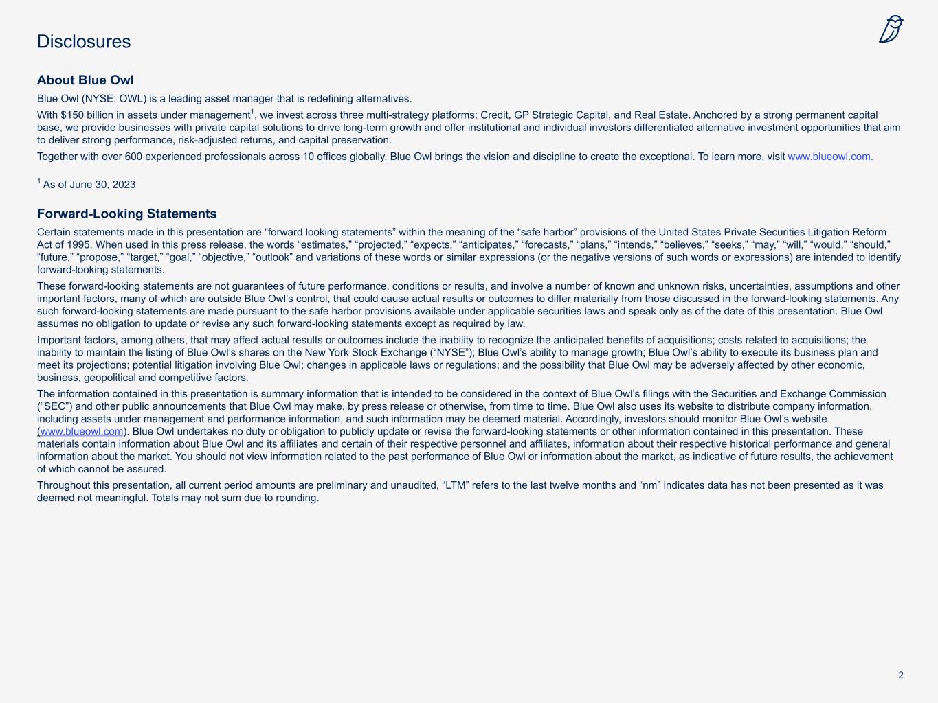2 About Blue Owl Blue Owl (NYSE: OWL) is a leading asset manager that is redefining alternatives. With $150 billion in assets under management1, we invest across three multi-strategy platforms: Credit, GP Strategic Capital, and Real Estate. Anchored by a strong permanent capital base, we provide businesses with private capital solutions to drive long-term growth and offer institutional and individual investors differentiated alternative investment opportunities that aim to deliver strong performance, risk-adjusted returns, and capital preservation. Together with over 600 experienced professionals across 10 offices globally, Blue Owl brings the vision and discipline to create the exceptional. To learn more, visit www.blueowl.com. 1 As of June 30, 2023 Forward-Looking Statements Certain statements made in this presentation are “forward looking statements” within the meaning of the “safe harbor” provisions of the United States Private Securities Litigation Reform Act of 1995. When used in this press release, the words “estimates,” “projected,” “expects,” “anticipates,” “forecasts,” “plans,” “intends,” “believes,” “seeks,” “may,” “will,” “would,” “should,” “future,” “propose,” “target,” “goal,” “objective,” “outlook” and variations of these words or similar expressions (or the negative versions of such words or expressions) are intended to identify forward-looking statements. These forward-looking statements are not guarantees of future performance, conditions or results, and involve a number of known and unknown risks, uncertainties, assumptions and other important factors, many of which are outside Blue Owl’s control, that could cause actual results or outcomes to differ materially from those discussed in the forward-looking statements. Any such forward-looking statements are made pursuant to the safe harbor provisions available under applicable securities laws and speak only as of the date of this presentation. Blue Owl assumes no obligation to update or revise any such forward-looking statements except as required by law. Important factors, among others, that may affect actual results or outcomes include the inability to recognize the anticipated benefits of acquisitions; costs related to acquisitions; the inability to maintain the listing of Blue Owl’s shares on the New York Stock Exchange (“NYSE”); Blue Owl’s ability to manage growth; Blue Owl’s ability to execute its business plan and meet its projections; potential litigation involving Blue Owl; changes in applicable laws or regulations; and the possibility that Blue Owl may be adversely affected by other economic, business, geopolitical and competitive factors. The information contained in this presentation is summary information that is intended to be considered in the context of Blue Owl’s filings with the Securities and Exchange Commission (“SEC”) and other public announcements that Blue Owl may make, by press release or otherwise, from time to time. Blue Owl also uses its website to distribute company information, including assets under management and performance information, and such information may be deemed material. Accordingly, investors should monitor Blue Owl’s website (www.blueowl.com). Blue Owl undertakes no duty or obligation to publicly update or revise the forward-looking statements or other information contained in this presentation. These materials contain information about Blue Owl and its affiliates and certain of their respective personnel and affiliates, information about their respective historical performance and general information about the market. You should not view information related to the past performance of Blue Owl or information about the market, as indicative of future results, the achievement of which cannot be assured. Throughout this presentation, all current period amounts are preliminary and unaudited, “LTM” refers to the last twelve months and “nm” indicates data has not been presented as it was deemed not meaningful. Totals may not sum due to rounding. Disclosures