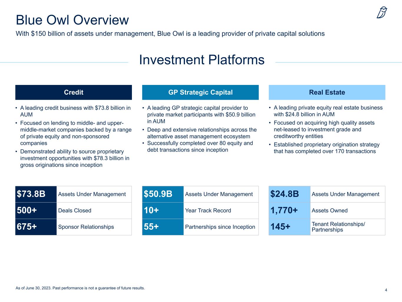 3 Disclosures Non-GAAP Financial Measures; Other Financial and Operational Data This presentation includes certain non-GAAP financial measures that are not prepared in accordance with accounting principles generally accepted in the United States (“GAAP”) and that may be different from non-GAAP financial measures used by other companies. Blue Owl believes that the use of these non-GAAP financial measures provides an additional tool for investors and potential investors to use in evaluating its ongoing operating results and trends. These non-GAAP measures should not be considered in isolation from, or as an alternative to, financial measures determined in accordance with GAAP. See the footnotes on the slides where these measures are discussed and reconciled to the most directly comparable GAAP measures. Exact net IRRs and multiples cannot be calculated for individual investments held by Blue Owl’s products, or a subset of such investments, due to the lack of a mechanism to precisely allocate fees, taxes, transaction costs, expenses and general partner carried interest. Valuations are as of the dates provided herein and do not take into account subsequent events, including the impact of inflation and rising interest rates, which can be expected to have an adverse effect on certain entities identified or contemplated herein. For the definitions of certain terms used in this presentation, please refer to the “Defined Terms” slide in the appendix. Important Notice No representations or warranties, express or implied are given in, or in respect of, this presentation. To the fullest extent permitted by law, in no circumstances will Blue Owl or any of its subsidiaries, stockholders, affiliates, representatives, partners, directors, officers, employees, advisers or agents be responsible or liable for any direct, indirect or consequential loss or loss of profit arising from use of this presentation, its contents, its omissions, reliance on the information contained within it, or on opinions communicated in relation thereto or otherwise arising in connection therewith. This presentation does not purport to be all-inclusive or to contain all of the information that may be required to make a full analysis of Blue Owl. Viewers of this presentation should each make their own evaluation of Blue Owl and of the relevance and adequacy of the information contained herein and should make sure other investigations as they deem necessary. This communication does not constitute an offer to sell, or the solicitation of an offer to buy or sell, any securities, investment funds, vehicles or accounts, investment advice or any other service by Blue Owl or any of its affiliates or subsidiaries. Nothing in this presentation constitutes the provision of tax, accounting, financial, investment, regulatory, legal or other advice by Blue Owl or its advisors. Industry and Market Data This presentation may contain information obtained from third parties, including ratings from credit ratings agencies such as Standard & Poor’s and Fitch Ratings. Such information has not been independently verified and, accordingly, Blue Owl makes no representation or warranty in respect of this information. Reproduction and distribution of third party content in any form is prohibited except with the prior written permission of the related third party. Third party content providers do not guarantee the accuracy, completeness, timeliness or availability of any information, including ratings, and are not responsible for any errors or omissions (negligent or otherwise), regardless of the cause, or for the results obtained from the use of such content. THIRD PARTY CONTENT PROVIDERS GIVE NO EXPRESS OR IMPLIED WARRANTIES, INCLUDING, BUT NOT LIMITED TO, ANY WARRANTIES OF MERCHANTABILITY OR FITNESS FOR A PARTICULAR PURPOSE OR USE. THIRD PARTY CONTENT PROVIDERS SHALL NOT BE LIABLE FOR ANY DIRECT, INDIRECT, INCIDENTAL, EXEMPLARY, COMPENSATORY, PUNITIVE, SPECIAL OR CONSEQUENTIAL DAMAGES, COSTS, EXPENSES, LEGAL FEES, OR LOSSES (INCLUDING LOST INCOME OR PROFITS AND OPPORTUNITY COSTS OR LOSSES CAUSED BY NEGLIGENCE) IN CONNECTION WITH ANY USE OF THEIR CONTENT, INCLUDING RATINGS. Credit ratings are statements of opinions and are not statements of fact or recommendations to purchase, hold or sell securities. They do not address the suitability of securities or the suitability of securities for investment purposes, and should not be relied on as investment advice.