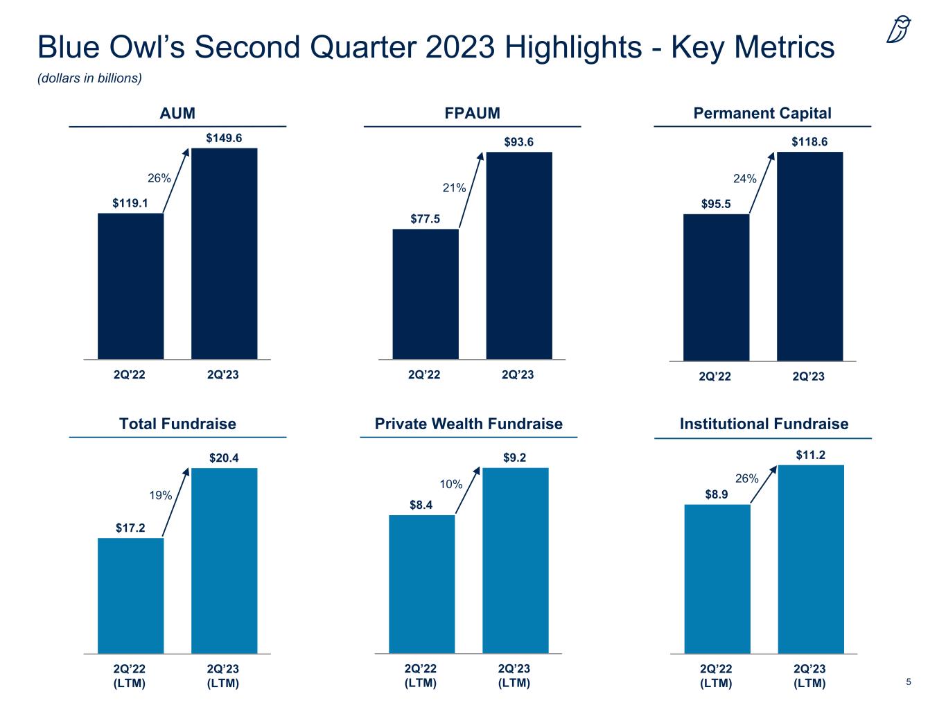 4As of June 30, 2023. Past performance is not a guarantee of future results. Blue Owl Overview With $150 billion of assets under management, Blue Owl is a leading provider of private capital solutions • A leading GP strategic capital provider to private market participants with $50.9 billion in AUM • Deep and extensive relationships across the alternative asset management ecosystem • Successfully completed over 80 equity and debt transactions since inception • A leading credit business with $73.8 billion in AUM • Focused on lending to middle- and upper- middle-market companies backed by a range of private equity and non-sponsored companies • Demonstrated ability to source proprietary investment opportunities with $78.3 billion in gross originations since inception GP Strategic CapitalCredit • A leading private equity real estate business with $24.8 billion in AUM • Focused on acquiring high quality assets net-leased to investment grade and creditworthy entities • Established proprietary origination strategy that has completed over 170 transactions Real Estate Investment Platforms $73.8B Assets Under Management 500+ Deals Closed 675+ Sponsor Relationships $50.9B Assets Under Management 10+ Year Track Record 55+ Partnerships since Inception $24.8B Assets Under Management 1,770+ Assets Owned 145+ Tenant Relationships/ Partnerships