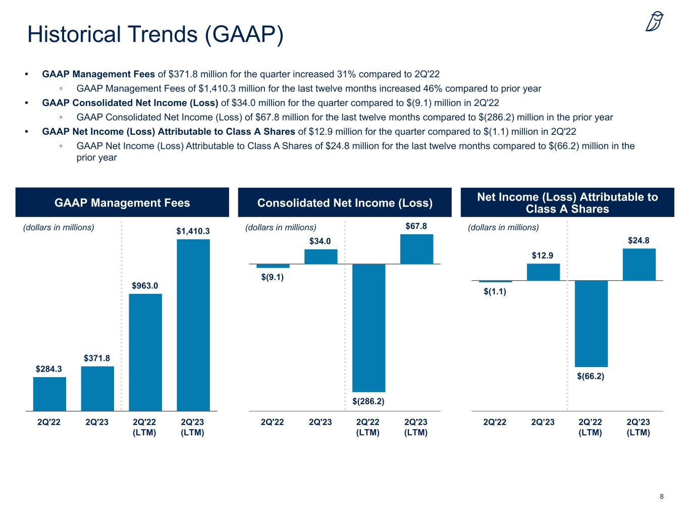 7 GAAP Results (Unaudited) Quarter Ended Last Twelve Months (dollars in thousands, except per share data) 2Q'23 2Q'22 % Change 2Q'23 2Q'22 % Change GAAP Revenues Credit (including Part I Fees of $90,853, $45,531, $314,402 and $171,200) $ 216,542 $ 145,710 49% $ 785,293 $ 513,273 53% GP Strategic Capital (including Part I Fees of $1,085, $815, $4,308 and $7,268) 124,845 119,391 5% 524,816 413,389 27% Real Estate 30,442 19,224 58% 100,194 36,382 175% Management Fees, Net 371,829 284,325 31% 1,410,303 963,044 46% Administrative, Transaction and Other Fees 45,108 42,921 5% 151,392 170,667 (11%) Realized Performance Income — — nm 12,727 5,906 115% GAAP Revenues 416,937 327,246 27% 1,574,422 1,139,617 38% GAAP Expenses Compensation and Benefits 208,281 218,118 (5%) 888,575 639,449 39% Amortization of Intangible Assets 115,917 64,885 79% 317,306 218,964 45% General, Administrative and Other Expenses 51,482 54,389 (5%) 230,543 171,571 34% GAAP Expenses 375,680 337,392 11% 1,436,424 1,029,984 39% GAAP Results GAAP Net Income (Loss) Attributable to Blue Owl Capital Inc. 12,859 (1,126) nm 24,828 (66,182) nm Earnings per Class A Share Basic $ 0.03 $ 0.00 Diluted $ 0.02 $ 0.00 Supplemental Information Credit $ 249,375 $ 181,363 38% $ 889,345 $ 663,669 34% GP Strategic Capital 134,045 126,659 6% 559,016 439,566 27% Real Estate 33,517 19,224 74% 126,061 36,382 246% GAAP Revenues 416,937 327,246 27% 1,574,422 1,139,617 38% Management Fees as % of Permanent Capital 93% 92% 93% 95%