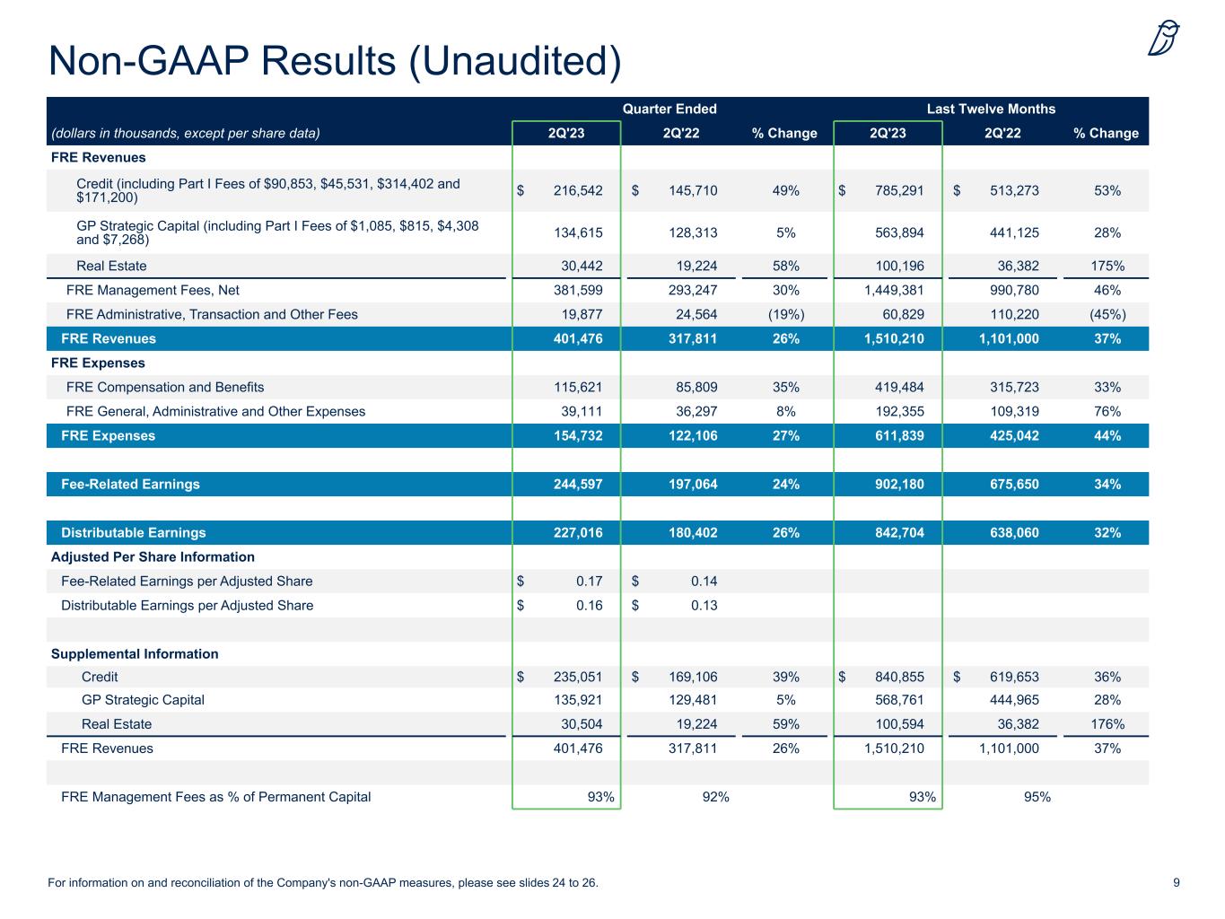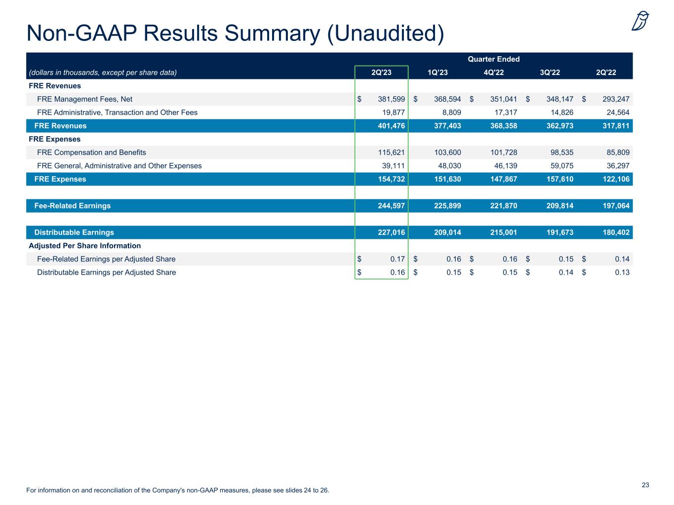 23 Quarter Ended (dollars in thousands, except per share data) 2Q'23 1Q’23 4Q'22 3Q'22 2Q'22 FRE Revenues FRE Management Fees, Net $ 381,599 $ 368,594 $ 351,041 $ 348,147 $ 293,247 FRE Administrative, Transaction and Other Fees 19,877 8,809 17,317 14,826 24,564 FRE Revenues 401,476 377,403 368,358 362,973 317,811 FRE Expenses FRE Compensation and Benefits 115,621 103,600 101,728 98,535 85,809 FRE General, Administrative and Other Expenses 39,111 48,030 46,139 59,075 36,297 FRE Expenses 154,732 151,630 147,867 157,610 122,106 Fee-Related Earnings 244,597 225,899 221,870 209,814 197,064 Distributable Earnings 227,016 209,014 215,001 191,673 180,402 Adjusted Per Share Information Fee-Related Earnings per Adjusted Share $ 0.17 $ 0.16 $ 0.16 $ 0.15 $ 0.14 Distributable Earnings per Adjusted Share $ 0.16 $ 0.15 $ 0.15 $ 0.14 $ 0.13 Non-GAAP Results Summary (Unaudited) For information on and reconciliation of the Company's non-GAAP measures, please see slides 24 to 26.