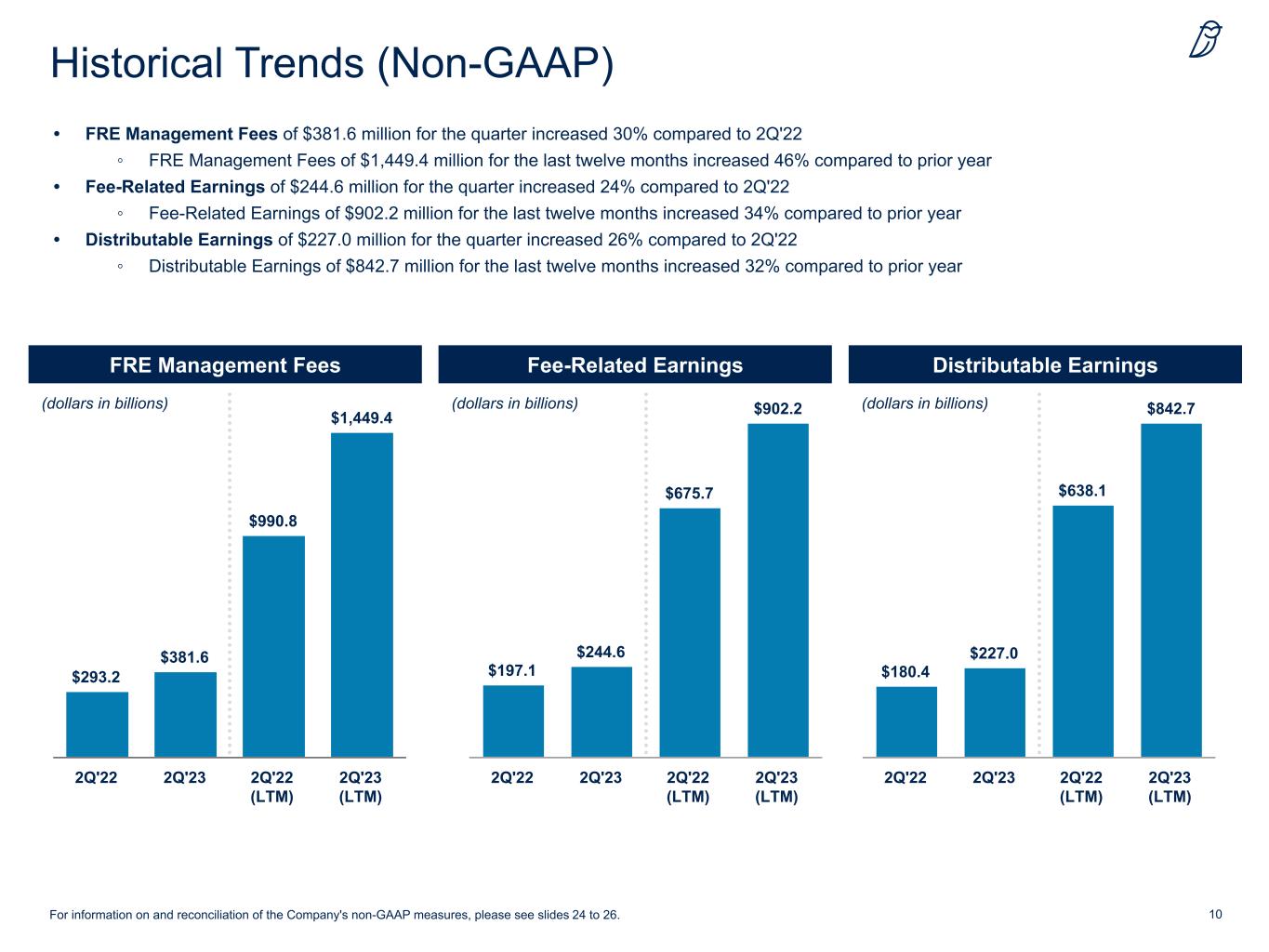 9 Non-GAAP Results (Unaudited) For information on and reconciliation of the Company's non-GAAP measures, please see slides 24 to 26. Quarter Ended Last Twelve Months (dollars in thousands, except per share data) 2Q'23 2Q'22 % Change 2Q'23 2Q'22 % Change FRE Revenues Credit (including Part I Fees of $90,853, $45,531, $314,402 and $171,200) $ 216,542 $ 145,710 49% $ 785,291 $ 513,273 53% GP Strategic Capital (including Part I Fees of $1,085, $815, $4,308 and $7,268) 134,615 128,313 5% 563,894 441,125 28% Real Estate 30,442 19,224 58% 100,196 36,382 175% FRE Management Fees, Net 381,599 293,247 30% 1,449,381 990,780 46% FRE Administrative, Transaction and Other Fees 19,877 24,564 (19%) 60,829 110,220 (45%) FRE Revenues 401,476 317,811 26% 1,510,210 1,101,000 37% FRE Expenses FRE Compensation and Benefits 115,621 85,809 35% 419,484 315,723 33% FRE General, Administrative and Other Expenses 39,111 36,297 8% 192,355 109,319 76% FRE Expenses 154,732 122,106 27% 611,839 425,042 44% Fee-Related Earnings 244,597 197,064 24% 902,180 675,650 34% Distributable Earnings 227,016 180,402 26% 842,704 638,060 32% Adjusted Per Share Information Fee-Related Earnings per Adjusted Share $ 0.17 $ 0.14 Distributable Earnings per Adjusted Share $ 0.16 $ 0.13 Supplemental Information Credit $ 235,051 $ 169,106 39% $ 840,855 $ 619,653 36% GP Strategic Capital 135,921 129,481 5% 568,761 444,965 28% Real Estate 30,504 19,224 59% 100,594 36,382 176% FRE Revenues 401,476 317,811 26% 1,510,210 1,101,000 37% FRE Management Fees as % of Permanent Capital 93% 92% 93% 95%