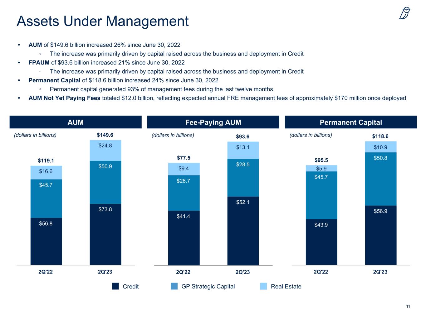 10 Historical Trends (Non-GAAP) • FRE Management Fees of $381.6 million for the quarter increased 30% compared to 2Q'22 ◦ FRE Management Fees of $1,449.4 million for the last twelve months increased 46% compared to prior year • Fee-Related Earnings of $244.6 million for the quarter increased 24% compared to 2Q'22 ◦ Fee-Related Earnings of $902.2 million for the last twelve months increased 34% compared to prior year • Distributable Earnings of $227.0 million for the quarter increased 26% compared to 2Q'22 ◦ Distributable Earnings of $842.7 million for the last twelve months increased 32% compared to prior year FRE Management Fees Distributable EarningsFee-Related Earnings (dollars in billions) (dollars in billions) (dollars in billions) $180.4 $227.0 $638.1 $842.7 2Q'22 2Q'23 2Q'22 (LTM) 2Q'23 (LTM) $197.1 $244.6 $675.7 $902.2 2Q'22 2Q'23 2Q'22 (LTM) 2Q'23 (LTM) $293.2 $381.6 $990.8 $1,449.4 2Q'22 2Q'23 2Q'22 (LTM) 2Q'23 (LTM) For information on and reconciliation of the Company's non-GAAP measures, please see slides 24 to 26.