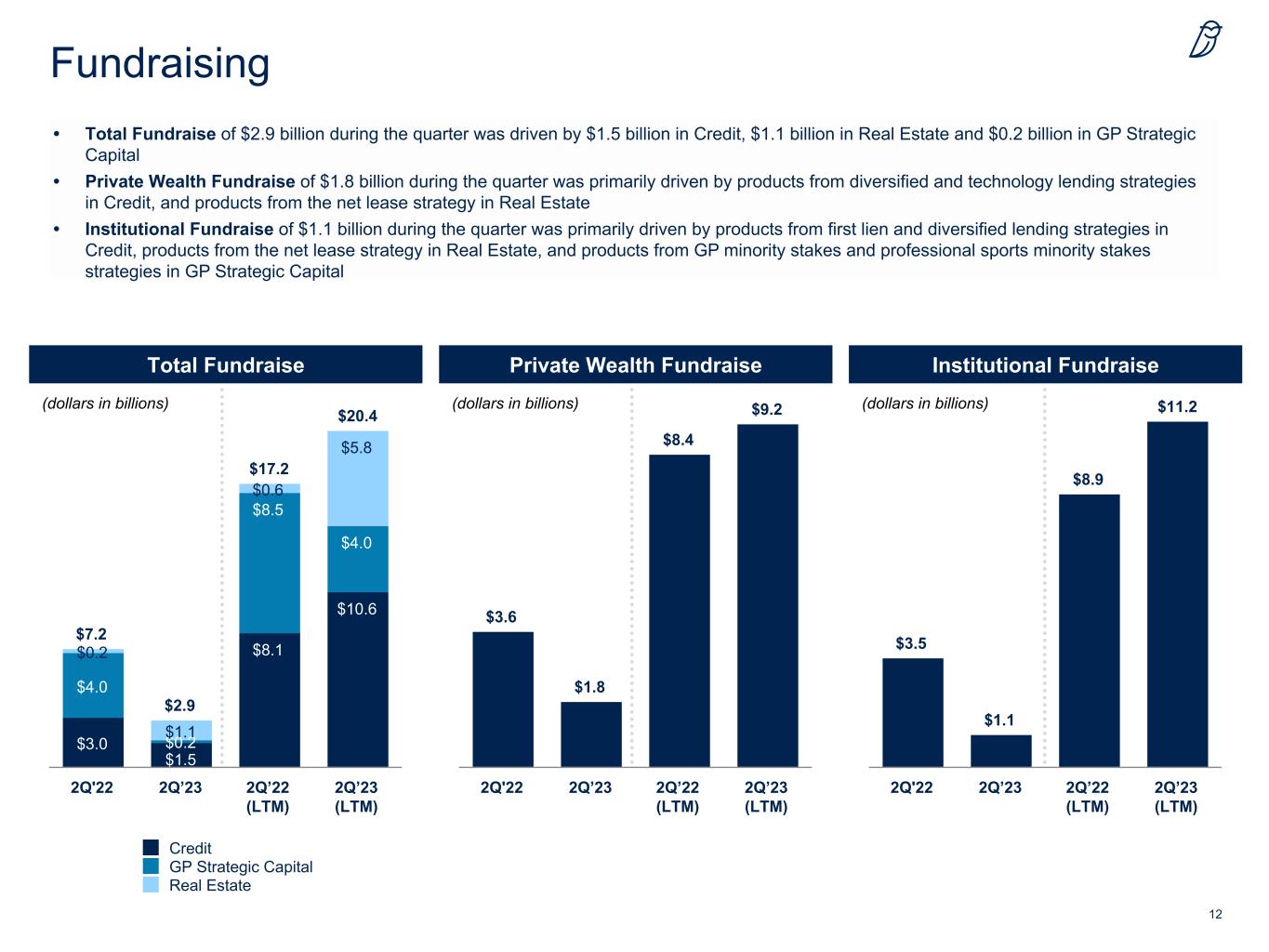 11 Assets Under Management • AUM of $149.6 billion increased 26% since June 30, 2022 ◦ The increase was primarily driven by capital raised across the business and deployment in Credit • FPAUM of $93.6 billion increased 21% since June 30, 2022 ◦ The increase was primarily driven by capital raised across the business and deployment in Credit • Permanent Capital of $118.6 billion increased 24% since June 30, 2022 ◦ Permanent capital generated 93% of management fees during the last twelve months • AUM Not Yet Paying Fees totaled $12.0 billion, reflecting expected annual FRE management fees of approximately $170 million once deployed AUM Fee-Paying AUM Permanent Capital Credit GP Strategic Capital Real Estate (dollars in billions) (dollars in billions) (dollars in billions) $119.1 $149.6 $56.8 $73.8 $45.7 $50.9 $16.6 $24.8 2Q'22 2Q'23 $77.5 $93.6 $41.4 $52.1 $26.7 $28.5 $9.4 $13.1 2Q'22 2Q'23 $95.5 $118.6 $43.9 $56.9 $45.7 $50.8 $5.9 $10.9 2Q'22 2Q'23