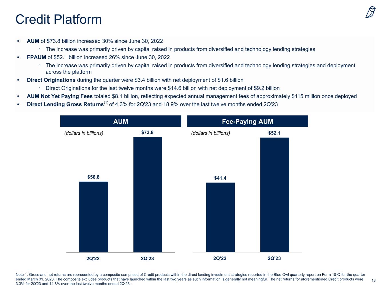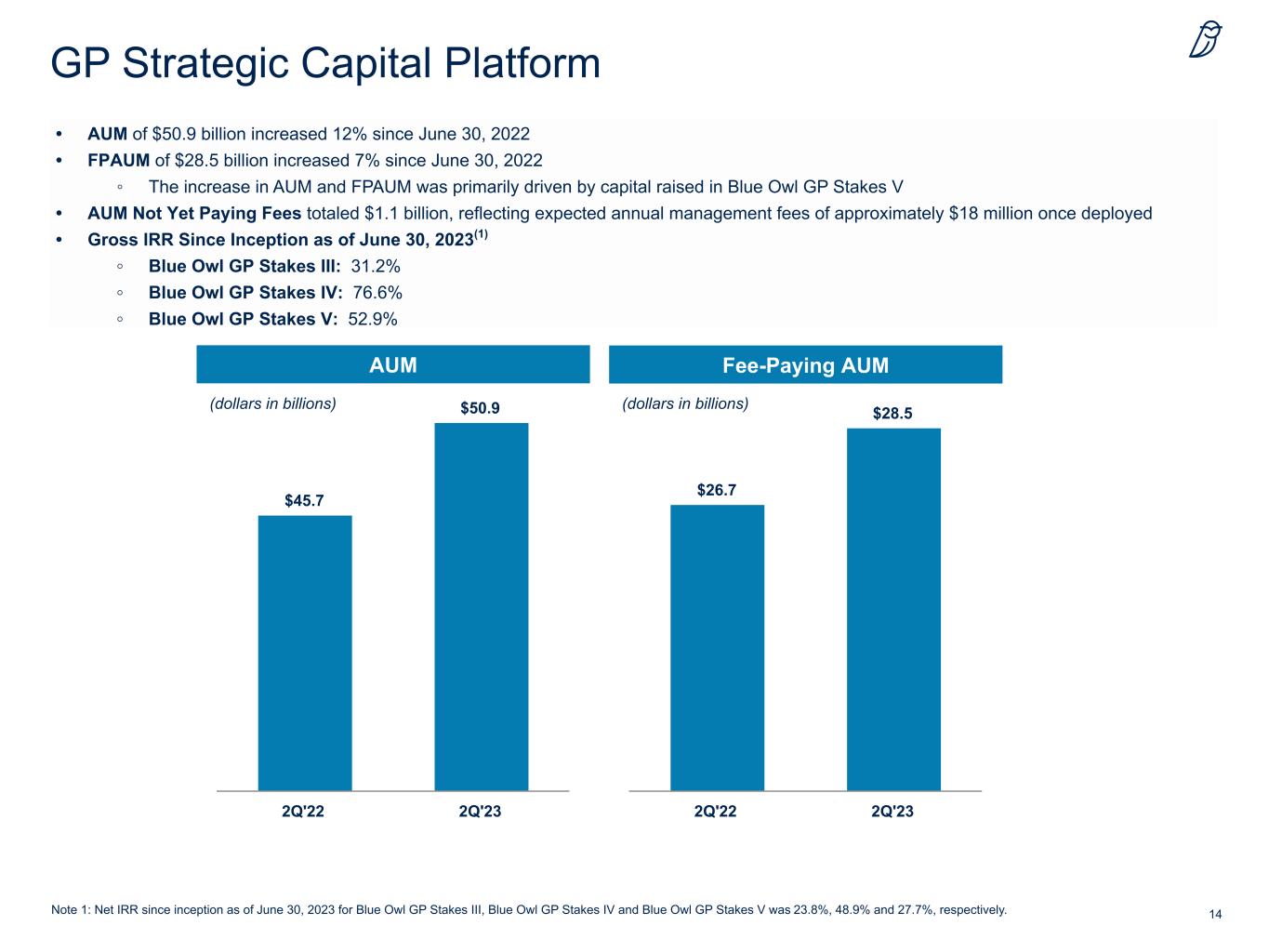 13 Credit Platform • AUM of $73.8 billion increased 30% since June 30, 2022 ◦ The increase was primarily driven by capital raised in products from diversified and technology lending strategies • FPAUM of $52.1 billion increased 26% since June 30, 2022 ◦ The increase was primarily driven by capital raised in products from diversified and technology lending strategies and deployment across the platform • Direct Originations during the quarter were $3.4 billion with net deployment of $1.6 billion ◦ Direct Originations for the last twelve months were $14.6 billion with net deployment of $9.2 billion • AUM Not Yet Paying Fees totaled $8.1 billion, reflecting expected annual management fees of approximately $115 million once deployed • Direct Lending Gross Returns(1) of 4.3% for 2Q'23 and 18.9% over the last twelve months ended 2Q'23 AUM (dollars in billions) (dollars in billions) Fee-Paying AUM Note 1. Gross and net returns are represented by a composite comprised of Credit products within the direct lending investment strategies reported in the Blue Owl quarterly report on Form 10-Q for the quarter ended March 31, 2023. The composite excludes products that have launched within the last two years as such information is generally not meaningful. The net returns for aforementioned Credit products were 3.3% for 2Q'23 and 14.8% over the last twelve months ended 2Q'23 . $56.8 $73.8 2Q'22 2Q'23 $41.4 $52.1 2Q'22 2Q'23
