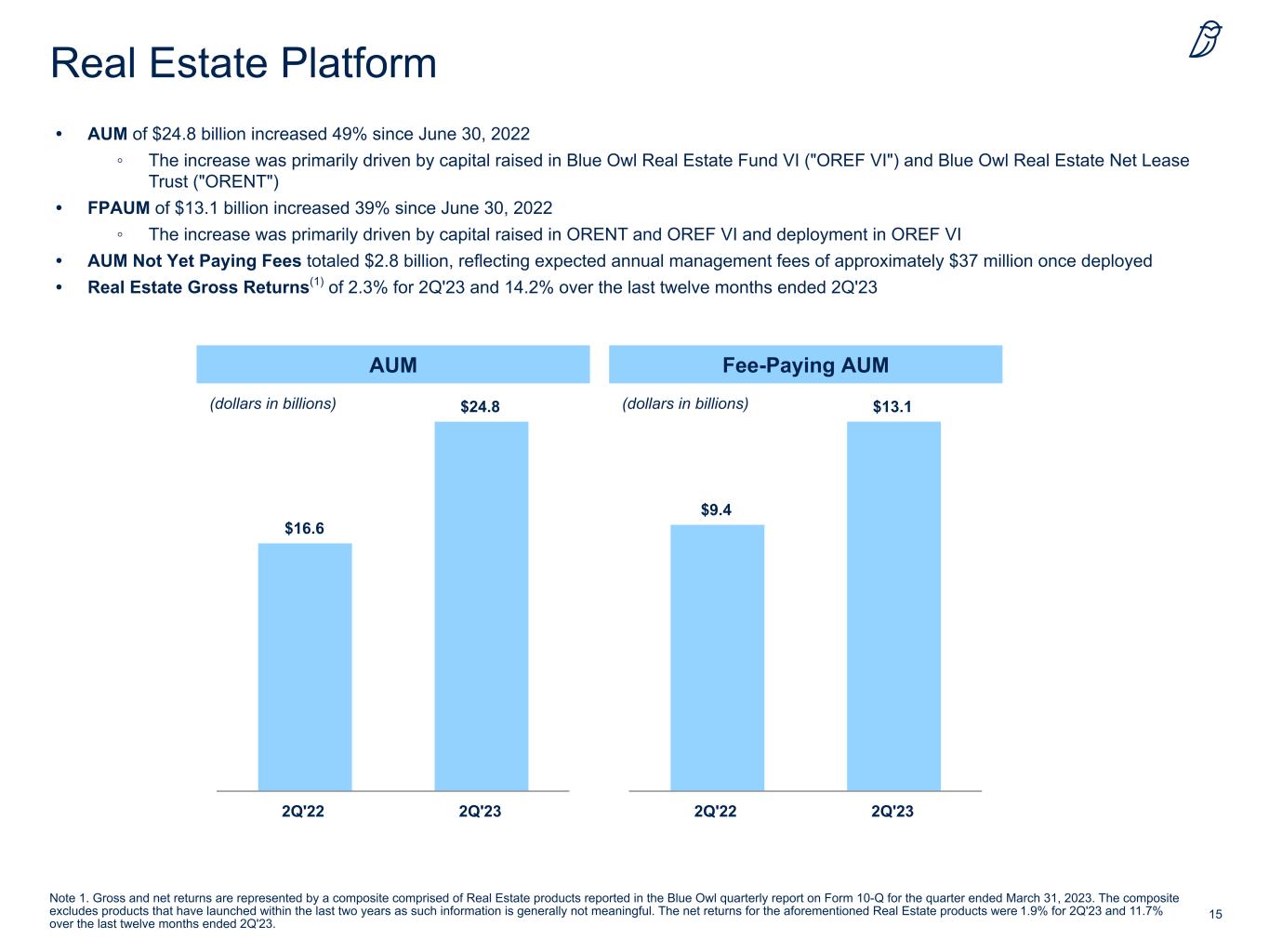14Note 1: Net IRR since inception as of June 30, 2023 for Blue Owl GP Stakes III, Blue Owl GP Stakes IV and Blue Owl GP Stakes V was 23.8%, 48.9% and 27.7%, respectively. GP Strategic Capital Platform • AUM of $50.9 billion increased 12% since June 30, 2022 • FPAUM of $28.5 billion increased 7% since June 30, 2022 ◦ The increase in AUM and FPAUM was primarily driven by capital raised in Blue Owl GP Stakes V • AUM Not Yet Paying Fees totaled $1.1 billion, reflecting expected annual management fees of approximately $18 million once deployed • Gross IRR Since Inception as of June 30, 2023(1) ◦ Blue Owl GP Stakes III: 31.2% ◦ Blue Owl GP Stakes IV: 76.6% ◦ Blue Owl GP Stakes V: 52.9% AUM Fee-Paying AUM $45.7 $50.9 2Q'22 2Q'23 $26.7 $28.5 2Q'22 2Q'23 (dollars in billions)(dollars in billions)