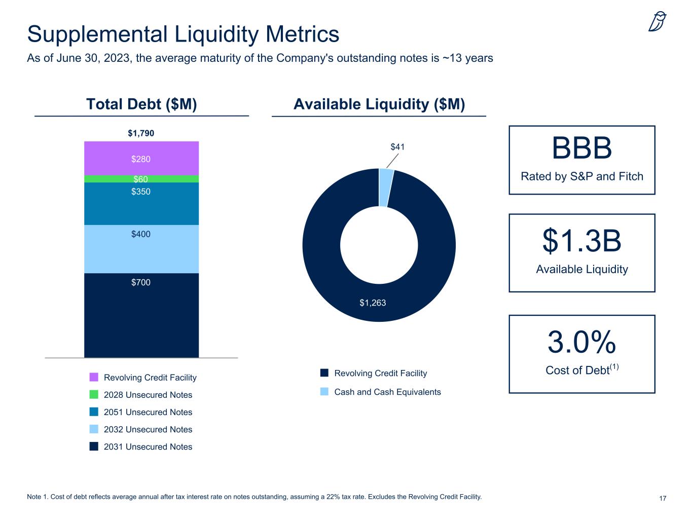 17 As of June 30, 2023, the average maturity of the Company's outstanding notes is ~13 years Note 1. Cost of debt reflects average annual after tax interest rate on notes outstanding, assuming a 22% tax rate. Excludes the Revolving Credit Facility. Supplemental Liquidity Metrics BBB Rated by S&P and Fitch $1.3B Available Liquidity Total Debt ($M) Available Liquidity ($M) 3.0% Cost of Debt(1) $759 $41 $1,263 Revolving Credit Facility Cash and Cash Equivalents $1,790 $700 $400 $350 $60 $280 Revolving Credit Facility 2028 Unsecured Notes 2051 Unsecured Notes 2032 Unsecured Notes 2031 Unsecured Notes