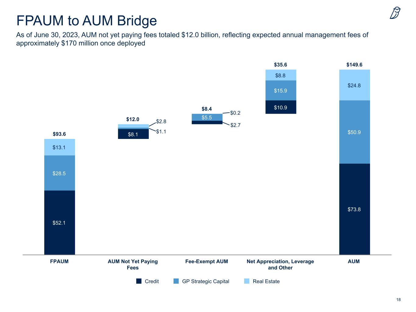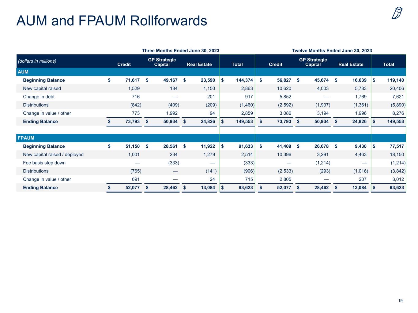 18 As of June 30, 2023, AUM not yet paying fees totaled $12.0 billion, reflecting expected annual management fees of approximately $170 million once deployed FPAUM to AUM Bridge $51.2 $71.6 $28.6 $93.6 $149.6 $93.6 $105.6 $114.0 $52.1 $8.1 $10.9 $73.8 $28.5 $5.5 $15.9 $50.9 $13.1 $8.8 $24.8 $12.0 $8.4 $35.6 Credit GP Strategic Capital Real Estate FPAUM AUM Not Yet Paying Fees Fee-Exempt AUM Net Appreciation, Leverage and Other AUM $0.2 $2.7 $2.8 $1.1