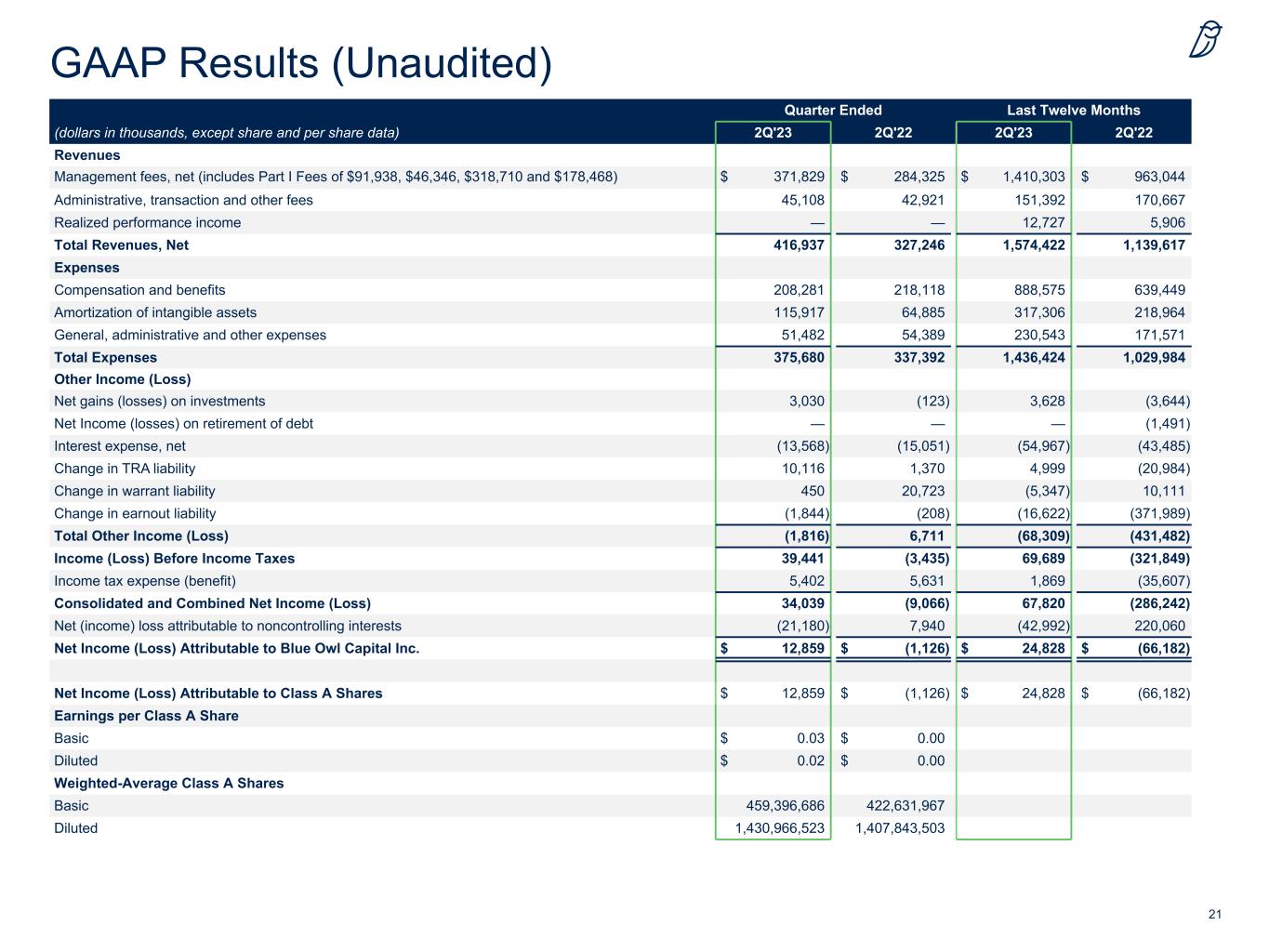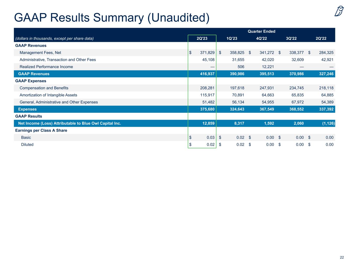 21 GAAP Results (Unaudited) Quarter Ended Last Twelve Months (dollars in thousands, except share and per share data) 2Q'23 2Q'22 2Q'23 2Q'22 Revenues Management fees, net (includes Part I Fees of $91,938, $46,346, $318,710 and $178,468) $ 371,829 $ 284,325 $ 1,410,303 $ 963,044 Administrative, transaction and other fees 45,108 42,921 151,392 170,667 Realized performance income — — 12,727 5,906 Total Revenues, Net 416,937 327,246 1,574,422 1,139,617 Expenses Compensation and benefits 208,281 218,118 888,575 639,449 Amortization of intangible assets 115,917 64,885 317,306 218,964 General, administrative and other expenses 51,482 54,389 230,543 171,571 Total Expenses 375,680 337,392 1,436,424 1,029,984 Other Income (Loss) Net gains (losses) on investments 3,030 (123) 3,628 (3,644) Net Income (losses) on retirement of debt — — — (1,491) Interest expense, net (13,568) (15,051) (54,967) (43,485) Change in TRA liability 10,116 1,370 4,999 (20,984) Change in warrant liability 450 20,723 (5,347) 10,111 Change in earnout liability (1,844) (208) (16,622) (371,989) Total Other Income (Loss) (1,816) 6,711 (68,309) (431,482) Income (Loss) Before Income Taxes 39,441 (3,435) 69,689 (321,849) Income tax expense (benefit) 5,402 5,631 1,869 (35,607) Consolidated and Combined Net Income (Loss) 34,039 (9,066) 67,820 (286,242) Net (income) loss attributable to noncontrolling interests (21,180) 7,940 (42,992) 220,060 Net Income (Loss) Attributable to Blue Owl Capital Inc. $ 12,859 $ (1,126) $ 24,828 $ (66,182) Net Income (Loss) Attributable to Class A Shares $ 12,859 $ (1,126) $ 24,828 $ (66,182) Earnings per Class A Share Basic $ 0.03 $ 0.00 Diluted $ 0.02 $ 0.00 Weighted-Average Class A Shares Basic 459,396,686 422,631,967 Diluted 1,430,966,523 1,407,843,503
