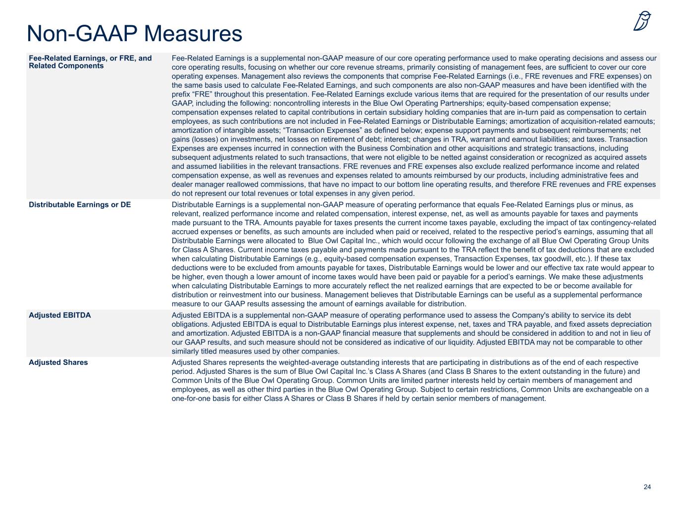 24 Non-GAAP Measures Fee-Related Earnings, or FRE, and Related Components Fee-Related Earnings is a supplemental non-GAAP measure of our core operating performance used to make operating decisions and assess our core operating results, focusing on whether our core revenue streams, primarily consisting of management fees, are sufficient to cover our core operating expenses. Management also reviews the components that comprise Fee-Related Earnings (i.e., FRE revenues and FRE expenses) on the same basis used to calculate Fee-Related Earnings, and such components are also non-GAAP measures and have been identified with the prefix “FRE” throughout this presentation. Fee-Related Earnings exclude various items that are required for the presentation of our results under GAAP, including the following: noncontrolling interests in the Blue Owl Operating Partnerships; equity-based compensation expense; compensation expenses related to capital contributions in certain subsidiary holding companies that are in-turn paid as compensation to certain employees, as such contributions are not included in Fee-Related Earnings or Distributable Earnings; amortization of acquisition-related earnouts; amortization of intangible assets; “Transaction Expenses” as defined below; expense support payments and subsequent reimbursements; net gains (losses) on investments, net losses on retirement of debt; interest; changes in TRA, warrant and earnout liabilities; and taxes. Transaction Expenses are expenses incurred in connection with the Business Combination and other acquisitions and strategic transactions, including subsequent adjustments related to such transactions, that were not eligible to be netted against consideration or recognized as acquired assets and assumed liabilities in the relevant transactions. FRE revenues and FRE expenses also exclude realized performance income and related compensation expense, as well as revenues and expenses related to amounts reimbursed by our products, including administrative fees and dealer manager reallowed commissions, that have no impact to our bottom line operating results, and therefore FRE revenues and FRE expenses do not represent our total revenues or total expenses in any given period. Distributable Earnings or DE Distributable Earnings is a supplemental non-GAAP measure of operating performance that equals Fee-Related Earnings plus or minus, as relevant, realized performance income and related compensation, interest expense, net, as well as amounts payable for taxes and payments made pursuant to the TRA. Amounts payable for taxes presents the current income taxes payable, excluding the impact of tax contingency-related accrued expenses or benefits, as such amounts are included when paid or received, related to the respective period’s earnings, assuming that all Distributable Earnings were allocated to Blue Owl Capital Inc., which would occur following the exchange of all Blue Owl Operating Group Units for Class A Shares. Current income taxes payable and payments made pursuant to the TRA reflect the benefit of tax deductions that are excluded when calculating Distributable Earnings (e.g., equity-based compensation expenses, Transaction Expenses, tax goodwill, etc.). If these tax deductions were to be excluded from amounts payable for taxes, Distributable Earnings would be lower and our effective tax rate would appear to be higher, even though a lower amount of income taxes would have been paid or payable for a period’s earnings. We make these adjustments when calculating Distributable Earnings to more accurately reflect the net realized earnings that are expected to be or become available for distribution or reinvestment into our business. Management believes that Distributable Earnings can be useful as a supplemental performance measure to our GAAP results assessing the amount of earnings available for distribution. Adjusted EBITDA Adjusted EBITDA is a supplemental non-GAAP measure of operating performance used to assess the Company's ability to service its debt obligations. Adjusted EBITDA is equal to Distributable Earnings plus interest expense, net, taxes and TRA payable, and fixed assets depreciation and amortization. Adjusted EBITDA is a non-GAAP financial measure that supplements and should be considered in addition to and not in lieu of our GAAP results, and such measure should not be considered as indicative of our liquidity. Adjusted EBITDA may not be comparable to other similarly titled measures used by other companies. Adjusted Shares Adjusted Shares represents the weighted-average outstanding interests that are participating in distributions as of the end of each respective period. Adjusted Shares is the sum of Blue Owl Capital Inc.’s Class A Shares (and Class B Shares to the extent outstanding in the future) and Common Units of the Blue Owl Operating Group. Common Units are limited partner interests held by certain members of management and employees, as well as other third parties in the Blue Owl Operating Group. Subject to certain restrictions, Common Units are exchangeable on a one-for-one basis for either Class A Shares or Class B Shares if held by certain senior members of management.