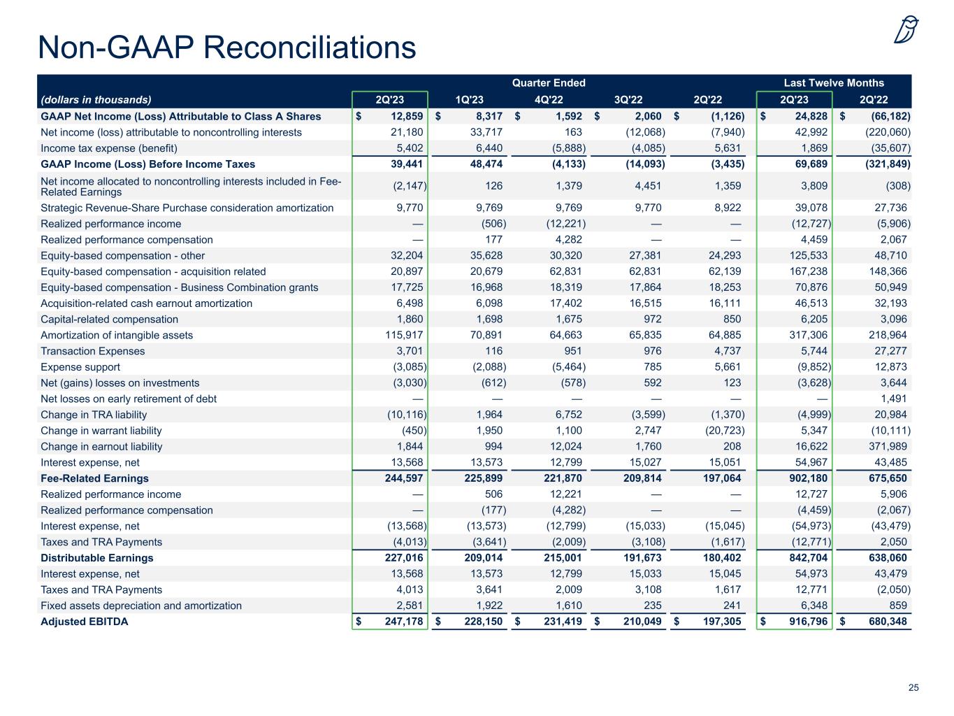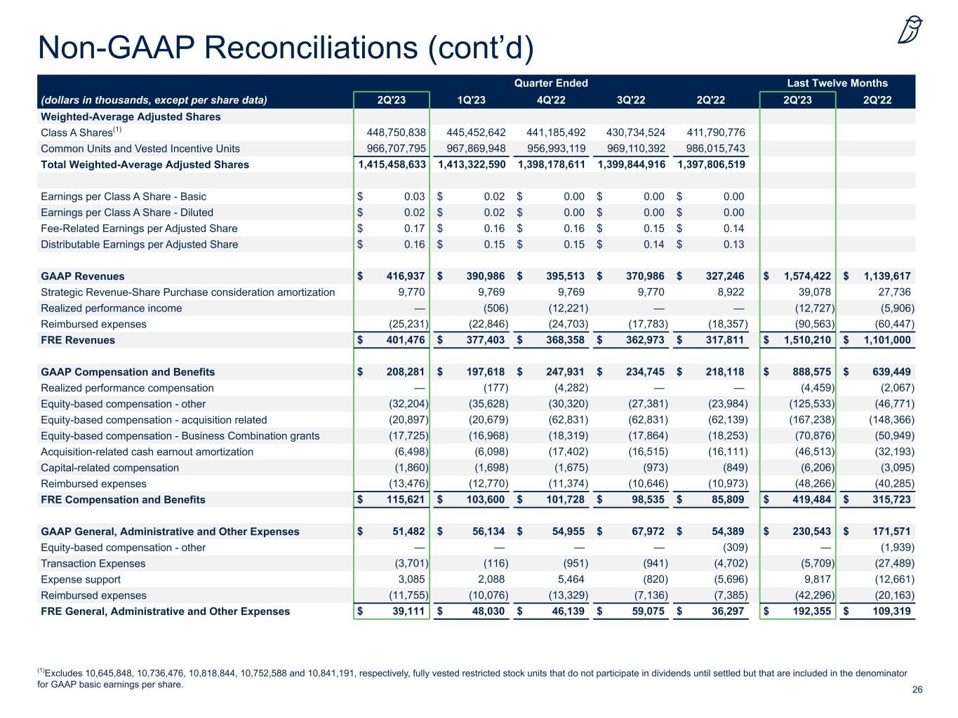 25 Non-GAAP Reconciliations Quarter Ended Last Twelve Months (dollars in thousands) 2Q'23 1Q'23 4Q'22 3Q'22 2Q'22 2Q'23 2Q'22 GAAP Net Income (Loss) Attributable to Class A Shares $ 12,859 $ 8,317 $ 1,592 $ 2,060 $ (1,126) $ 24,828 $ (66,182) Net income (loss) attributable to noncontrolling interests 21,180 33,717 163 (12,068) (7,940) 42,992 (220,060) Income tax expense (benefit) 5,402 6,440 (5,888) (4,085) 5,631 1,869 (35,607) GAAP Income (Loss) Before Income Taxes 39,441 48,474 (4,133) (14,093) (3,435) 69,689 (321,849) Net income allocated to noncontrolling interests included in Fee- Related Earnings (2,147) 126 1,379 4,451 1,359 3,809 (308) Strategic Revenue-Share Purchase consideration amortization 9,770 9,769 9,769 9,770 8,922 39,078 27,736 Realized performance income — (506) (12,221) — — (12,727) (5,906) Realized performance compensation — 177 4,282 — — 4,459 2,067 Equity-based compensation - other 32,204 35,628 30,320 27,381 24,293 125,533 48,710 Equity-based compensation - acquisition related 20,897 20,679 62,831 62,831 62,139 167,238 148,366 Equity-based compensation - Business Combination grants 17,725 16,968 18,319 17,864 18,253 70,876 50,949 Acquisition-related cash earnout amortization 6,498 6,098 17,402 16,515 16,111 46,513 32,193 Capital-related compensation 1,860 1,698 1,675 972 850 6,205 3,096 Amortization of intangible assets 115,917 70,891 64,663 65,835 64,885 317,306 218,964 Transaction Expenses 3,701 116 951 976 4,737 5,744 27,277 Expense support (3,085) (2,088) (5,464) 785 5,661 (9,852) 12,873 Net (gains) losses on investments (3,030) (612) (578) 592 123 (3,628) 3,644 Net losses on early retirement of debt — — — — — — 1,491 Change in TRA liability (10,116) 1,964 6,752 (3,599) (1,370) (4,999) 20,984 Change in warrant liability (450) 1,950 1,100 2,747 (20,723) 5,347 (10,111) Change in earnout liability 1,844 994 12,024 1,760 208 16,622 371,989 Interest expense, net 13,568 13,573 12,799 15,027 15,051 54,967 43,485 Fee-Related Earnings 244,597 225,899 221,870 209,814 197,064 902,180 675,650 Realized performance income — 506 12,221 — — 12,727 5,906 Realized performance compensation — (177) (4,282) — — (4,459) (2,067) Interest expense, net (13,568) (13,573) (12,799) (15,033) (15,045) (54,973) (43,479) Taxes and TRA Payments (4,013) (3,641) (2,009) (3,108) (1,617) (12,771) 2,050 Distributable Earnings 227,016 209,014 215,001 191,673 180,402 842,704 638,060 Interest expense, net 13,568 13,573 12,799 15,033 15,045 54,973 43,479 Taxes and TRA Payments 4,013 3,641 2,009 3,108 1,617 12,771 (2,050) Fixed assets depreciation and amortization 2,581 1,922 1,610 235 241 6,348 859 Adjusted EBITDA $ 247,178 $ 228,150 $ 231,419 $ 210,049 $ 197,305 $ 916,796 $ 680,348