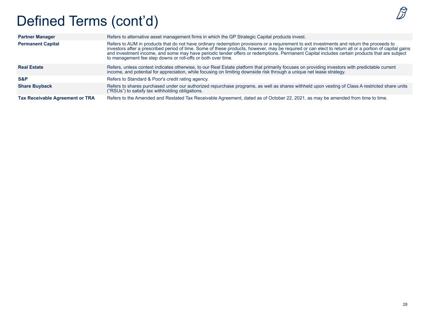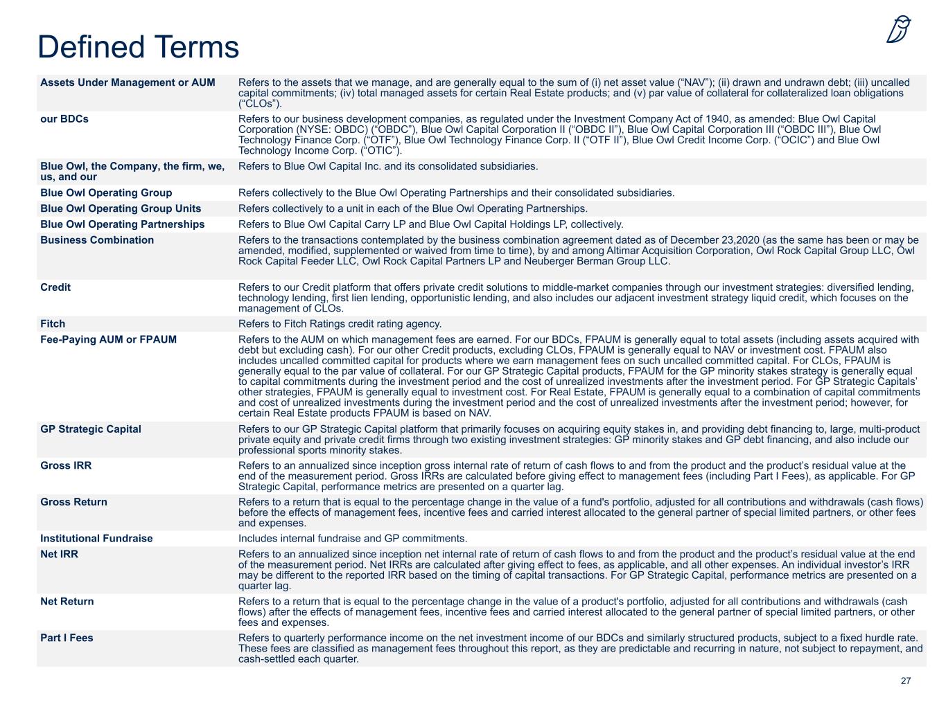 27 Defined Terms Assets Under Management or AUM Refers to the assets that we manage, and are generally equal to the sum of (i) net asset value (“NAV”); (ii) drawn and undrawn debt; (iii) uncalled capital commitments; (iv) total managed assets for certain Real Estate products; and (v) par value of collateral for collateralized loan obligations (“CLOs”). our BDCs Refers to our business development companies, as regulated under the Investment Company Act of 1940, as amended: Blue Owl Capital Corporation (NYSE: OBDC) (“OBDC”), Blue Owl Capital Corporation II (“OBDC II”), Blue Owl Capital Corporation III (“OBDC III”), Blue Owl Technology Finance Corp. (“OTF”), Blue Owl Technology Finance Corp. II (“OTF II”), Blue Owl Credit Income Corp. (“OCIC”) and Blue Owl Technology Income Corp. (“OTIC”). Blue Owl, the Company, the firm, we, us, and our Refers to Blue Owl Capital Inc. and its consolidated subsidiaries. Blue Owl Operating Group Refers collectively to the Blue Owl Operating Partnerships and their consolidated subsidiaries. Blue Owl Operating Group Units Refers collectively to a unit in each of the Blue Owl Operating Partnerships. Blue Owl Operating Partnerships Refers to Blue Owl Capital Carry LP and Blue Owl Capital Holdings LP, collectively. Business Combination Refers to the transactions contemplated by the business combination agreement dated as of December 23,2020 (as the same has been or may be amended, modified, supplemented or waived from time to time), by and among Altimar Acquisition Corporation, Owl Rock Capital Group LLC, Owl Rock Capital Feeder LLC, Owl Rock Capital Partners LP and Neuberger Berman Group LLC. Credit Refers to our Credit platform that offers private credit solutions to middle-market companies through our investment strategies: diversified lending, technology lending, first lien lending, opportunistic lending, and also includes our adjacent investment strategy liquid credit, which focuses on the management of CLOs. Fitch Refers to Fitch Ratings credit rating agency. Fee-Paying AUM or FPAUM Refers to the AUM on which management fees are earned. For our BDCs, FPAUM is generally equal to total assets (including assets acquired with debt but excluding cash). For our other Credit products, excluding CLOs, FPAUM is generally equal to NAV or investment cost. FPAUM also includes uncalled committed capital for products where we earn management fees on such uncalled committed capital. For CLOs, FPAUM is generally equal to the par value of collateral. For our GP Strategic Capital products, FPAUM for the GP minority stakes strategy is generally equal to capital commitments during the investment period and the cost of unrealized investments after the investment period. For GP Strategic Capitals’ other strategies, FPAUM is generally equal to investment cost. For Real Estate, FPAUM is generally equal to a combination of capital commitments and cost of unrealized investments during the investment period and the cost of unrealized investments after the investment period; however, for certain Real Estate products FPAUM is based on NAV. GP Strategic Capital Refers to our GP Strategic Capital platform that primarily focuses on acquiring equity stakes in, and providing debt financing to, large, multi-product private equity and private credit firms through two existing investment strategies: GP minority stakes and GP debt financing, and also include our professional sports minority stakes. Gross IRR Refers to an annualized since inception gross internal rate of return of cash flows to and from the product and the product’s residual value at the end of the measurement period. Gross IRRs are calculated before giving effect to management fees (including Part I Fees), as applicable. For GP Strategic Capital, performance metrics are presented on a quarter lag. Gross Return Refers to a return that is equal to the percentage change in the value of a fund's portfolio, adjusted for all contributions and withdrawals (cash flows) before the effects of management fees, incentive fees and carried interest allocated to the general partner of special limited partners, or other fees and expenses. Institutional Fundraise Includes internal fundraise and GP commitments. Net IRR Refers to an annualized since inception net internal rate of return of cash flows to and from the product and the product’s residual value at the end of the measurement period. Net IRRs are calculated after giving effect to fees, as applicable, and all other expenses. An individual investor’s IRR may be different to the reported IRR based on the timing of capital transactions. For GP Strategic Capital, performance metrics are presented on a quarter lag. Net Return Refers to a return that is equal to the percentage change in the value of a product's portfolio, adjusted for all contributions and withdrawals (cash flows) after the effects of management fees, incentive fees and carried interest allocated to the general partner of special limited partners, or other fees and expenses. Part I Fees Refers to quarterly performance income on the net investment income of our BDCs and similarly structured products, subject to a fixed hurdle rate. These fees are classified as management fees throughout this report, as they are predictable and recurring in nature, not subject to repayment, and cash-settled each quarter.