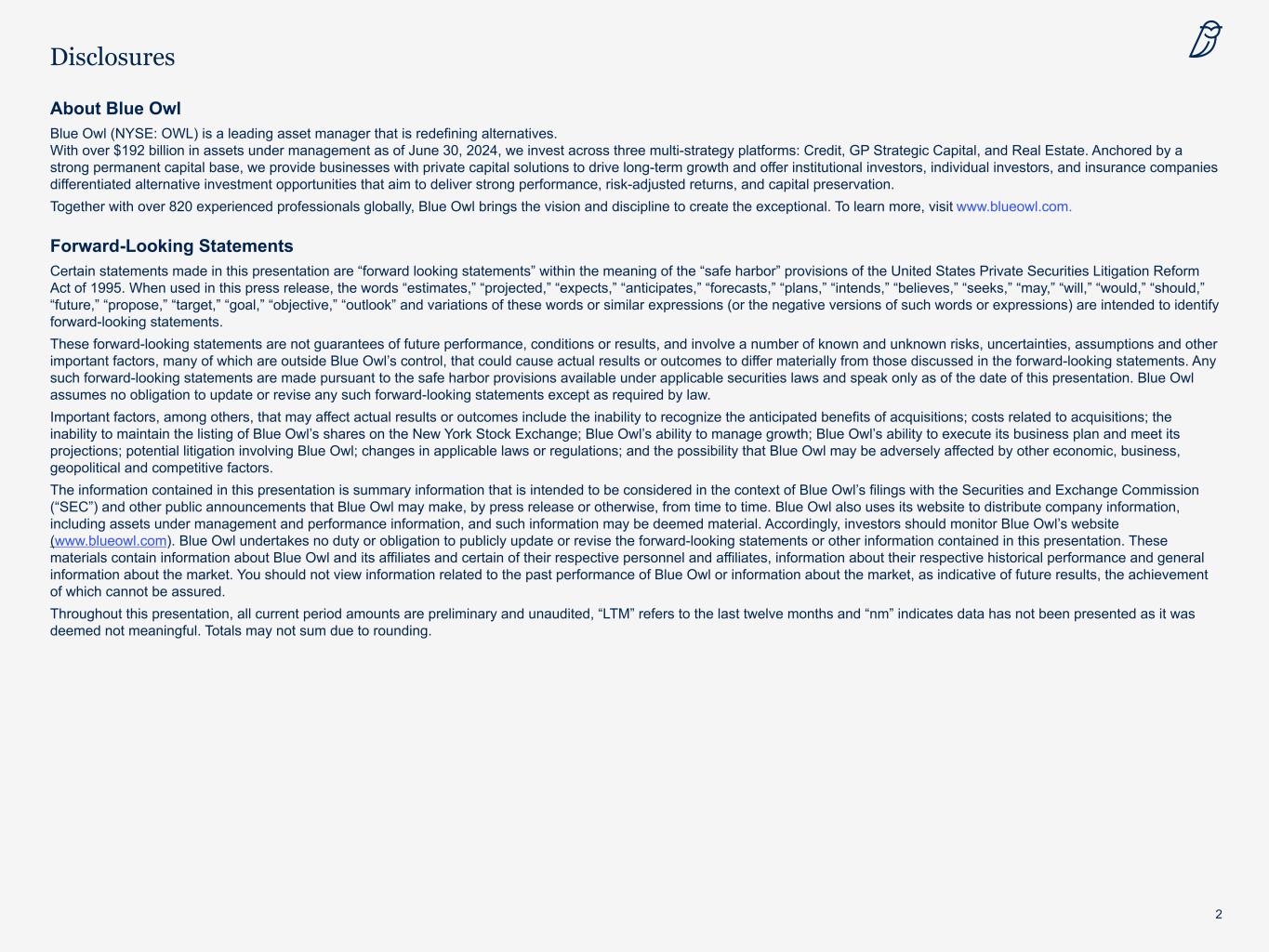2 About Blue Owl Blue Owl (NYSE: OWL) is a leading asset manager that is redefining alternatives. With over $192 billion in assets under management as of June 30, 2024, we invest across three multi-strategy platforms: Credit, GP Strategic Capital, and Real Estate. Anchored by a strong permanent capital base, we provide businesses with private capital solutions to drive long-term growth and offer institutional investors, individual investors, and insurance companies differentiated alternative investment opportunities that aim to deliver strong performance, risk-adjusted returns, and capital preservation. Together with over 820 experienced professionals globally, Blue Owl brings the vision and discipline to create the exceptional. To learn more, visit www.blueowl.com. Forward-Looking Statements Certain statements made in this presentation are “forward looking statements” within the meaning of the “safe harbor” provisions of the United States Private Securities Litigation Reform Act of 1995. When used in this press release, the words “estimates,” “projected,” “expects,” “anticipates,” “forecasts,” “plans,” “intends,” “believes,” “seeks,” “may,” “will,” “would,” “should,” “future,” “propose,” “target,” “goal,” “objective,” “outlook” and variations of these words or similar expressions (or the negative versions of such words or expressions) are intended to identify forward-looking statements. These forward-looking statements are not guarantees of future performance, conditions or results, and involve a number of known and unknown risks, uncertainties, assumptions and other important factors, many of which are outside Blue Owl’s control, that could cause actual results or outcomes to differ materially from those discussed in the forward-looking statements. Any such forward-looking statements are made pursuant to the safe harbor provisions available under applicable securities laws and speak only as of the date of this presentation. Blue Owl assumes no obligation to update or revise any such forward-looking statements except as required by law. Important factors, among others, that may affect actual results or outcomes include the inability to recognize the anticipated benefits of acquisitions; costs related to acquisitions; the inability to maintain the listing of Blue Owl’s shares on the New York Stock Exchange; Blue Owl’s ability to manage growth; Blue Owl’s ability to execute its business plan and meet its projections; potential litigation involving Blue Owl; changes in applicable laws or regulations; and the possibility that Blue Owl may be adversely affected by other economic, business, geopolitical and competitive factors. The information contained in this presentation is summary information that is intended to be considered in the context of Blue Owl’s filings with the Securities and Exchange Commission (“SEC”) and other public announcements that Blue Owl may make, by press release or otherwise, from time to time. Blue Owl also uses its website to distribute company information, including assets under management and performance information, and such information may be deemed material. Accordingly, investors should monitor Blue Owl’s website (www.blueowl.com). Blue Owl undertakes no duty or obligation to publicly update or revise the forward-looking statements or other information contained in this presentation. These materials contain information about Blue Owl and its affiliates and certain of their respective personnel and affiliates, information about their respective historical performance and general information about the market. You should not view information related to the past performance of Blue Owl or information about the market, as indicative of future results, the achievement of which cannot be assured. Throughout this presentation, all current period amounts are preliminary and unaudited, “LTM” refers to the last twelve months and “nm” indicates data has not been presented as it was deemed not meaningful. Totals may not sum due to rounding. Disclosures