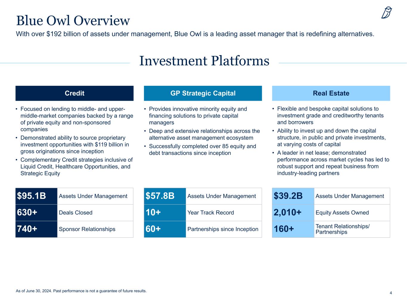 3 Disclosures Non-GAAP Financial Measures; Other Financial and Operational Data This presentation includes certain non-GAAP financial measures that are not prepared in accordance with accounting principles generally accepted in the United States (“GAAP”) and that may be different from non-GAAP financial measures used by other companies. Blue Owl believes that the use of these non-GAAP financial measures provides an additional tool for investors and potential investors to use in evaluating its ongoing operating results and trends. These non-GAAP measures should not be considered in isolation from, or as an alternative to, financial measures determined in accordance with GAAP. See the footnotes on the slides where these measures are discussed and reconciled to the most directly comparable GAAP measures. Exact net IRRs and multiples cannot be calculated for individual investments held by Blue Owl’s products, or a subset of such investments, due to the lack of a mechanism to precisely allocate fees, taxes, transaction costs, expenses and general partner carried interest. Valuations are as of the dates provided herein and do not take into account subsequent events, including the impact of inflation and rising interest rates, which can be expected to have an adverse effect on certain entities identified or contemplated herein. For the definitions of certain terms used in this presentation, please refer to the “Defined Terms” slides in the appendix. Important Notice No representations or warranties, express or implied are given in, or in respect of, this presentation. To the fullest extent permitted by law, in no circumstances will Blue Owl or any of its subsidiaries, stockholders, affiliates, representatives, partners, directors, officers, employees, advisers or agents be responsible or liable for any direct, indirect or consequential loss or loss of profit arising from use of this presentation, its contents, its omissions, reliance on the information contained within it, or on opinions communicated in relation thereto or otherwise arising in connection therewith. This presentation does not purport to be all-inclusive or to contain all of the information that may be required to make a full analysis of Blue Owl. Viewers of this presentation should each make their own evaluation of Blue Owl and of the relevance and adequacy of the information contained herein and should make sure other investigations as they deem necessary. This communication does not constitute an offer to sell, or the solicitation of an offer to buy or sell, any securities, investment funds, vehicles or accounts, investment advice or any other service by Blue Owl or any of its affiliates or subsidiaries. Nothing in this presentation constitutes the provision of tax, accounting, financial, investment, regulatory, legal or other advice by Blue Owl or its advisors. Industry and Market Data This presentation may contain information obtained from third parties, including ratings from credit ratings agencies such as Standard & Poor’s and Fitch Ratings. Such information has not been independently verified and, accordingly, Blue Owl makes no representation or warranty in respect of this information. Reproduction and distribution of third party content in any form is prohibited except with the prior written permission of the related third party. Third party content providers do not guarantee the accuracy, completeness, timeliness or availability of any information, including ratings, and are not responsible for any errors or omissions (negligent or otherwise), regardless of the cause, or for the results obtained from the use of such content. THIRD PARTY CONTENT PROVIDERS GIVE NO EXPRESS OR IMPLIED WARRANTIES, INCLUDING, BUT NOT LIMITED TO, ANY WARRANTIES OF MERCHANTABILITY OR FITNESS FOR A PARTICULAR PURPOSE OR USE. THIRD PARTY CONTENT PROVIDERS SHALL NOT BE LIABLE FOR ANY DIRECT, INDIRECT, INCIDENTAL, EXEMPLARY, COMPENSATORY, PUNITIVE, SPECIAL OR CONSEQUENTIAL DAMAGES, COSTS, EXPENSES, LEGAL FEES, OR LOSSES (INCLUDING LOST INCOME OR PROFITS AND OPPORTUNITY COSTS OR LOSSES CAUSED BY NEGLIGENCE) IN CONNECTION WITH ANY USE OF THEIR CONTENT, INCLUDING RATINGS. Credit ratings are statements of opinions and are not statements of fact or recommendations to purchase, hold or sell securities. They do not address the suitability of securities or the suitability of securities for investment purposes, and should not be relied on as investment advice. Copyright© Blue Owl Capital Inc. 2024. All rights reserved.