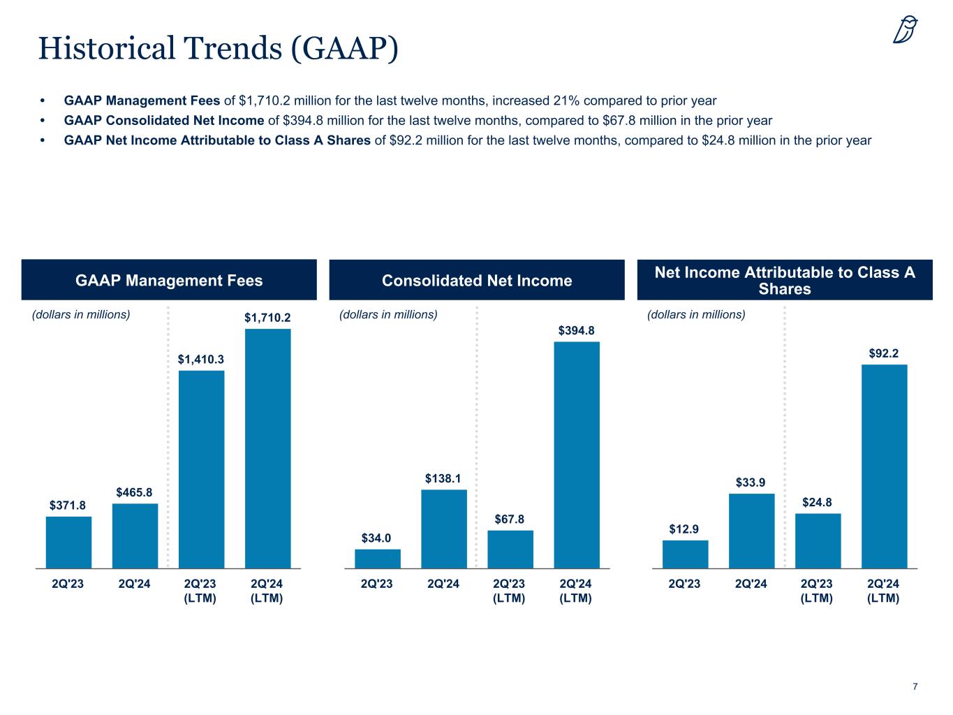 6 GAAP Results (Unaudited) Quarter Ended Last Twelve Months (dollars in thousands, except per share data) 2Q'24 2Q'23 % Change 2Q'24 2Q'23 % Change GAAP Revenues Credit (including Part I Fees of $127,135, $90,853, $451,045 and $314,402) $ 288,310 $ 216,542 33% $ 1,034,283 $ 785,293 32% GP Strategic Capital (including Part I Fees of $2,307, $1,085, $8,102 and $4,308) 135,235 124,845 8% 526,447 524,816 —% Real Estate 42,209 30,442 39% 149,509 100,194 49% Management Fees, Net 465,754 371,829 25% 1,710,239 1,410,303 21% Administrative, Transaction and Other Fees 83,906 45,108 86% 271,286 151,392 79% Performance Revenues 188 — nm 5,348 12,727 (58%) GAAP Revenues 549,848 416,937 32% 1,986,873 1,574,422 26% GAAP Expenses Compensation and Benefits 227,103 208,281 9% 916,637 888,575 3% Amortization of Intangible Assets 56,734 115,917 (51%) 226,462 317,306 (29%) General, Administrative and Other Expenses 93,458 51,482 82% 305,399 230,543 32% GAAP Expenses 377,295 375,680 —% 1,448,498 1,436,424 1% GAAP Results GAAP Net Income Attributable to Blue Owl Capital Inc. 33,945 12,859 164% 92,203 24,828 271% Earnings per Class A Share Basic $ 0.06 $ 0.03 Diluted $ 0.06 $ 0.02 Supplemental Information Credit $ 355,920 $ 249,375 43% $ 1,252,378 $ 889,345 41% GP Strategic Capital 145,348 134,045 8% 561,577 559,016 —% Real Estate 48,580 33,517 45% 172,918 126,061 37% GAAP Revenues 549,848 416,937 32% 1,986,873 1,574,422 26% GAAP Margin 28 % 9 % 22 % 4% Management Fees as % from Permanent Capital 91% 93% 91% 93%
