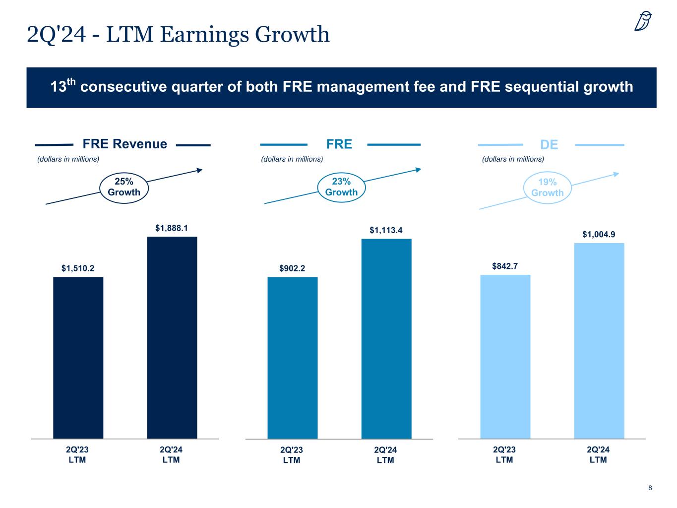 7 Historical Trends (GAAP) • GAAP Management Fees of $1,710.2 million for the last twelve months, increased 21% compared to prior year • GAAP Consolidated Net Income of $394.8 million for the last twelve months, compared to $67.8 million in the prior year • GAAP Net Income Attributable to Class A Shares of $92.2 million for the last twelve months, compared to $24.8 million in the prior year GAAP Management Fees Net Income Attributable to Class A SharesConsolidated Net Income (dollars in millions) (dollars in millions) (dollars in millions) $371.8 $465.8 $1,410.3 $1,710.2 2Q'23 2Q'24 2Q'23 (LTM) 2Q'24 (LTM) $12.9 $33.9 $24.8 $92.2 2Q'23 2Q'24 2Q'23 (LTM) 2Q'24 (LTM) $34.0 $138.1 $67.8 $394.8 2Q'23 2Q'24 2Q'23 (LTM) 2Q'24 (LTM)