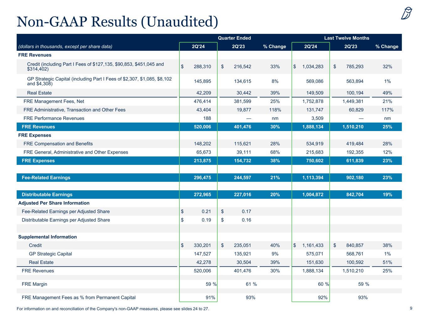 23 Quarter Ended (dollars in thousands, except per share data) 2Q'24 1Q'24 4Q'23 3Q'23 2Q'23 FRE Revenues FRE Management Fees, Net $ 476,414 $ 458,558 $ 421,238 $ 396,668 $ 381,599 FRE Administrative, Transaction and Other Fees 43,404 25,945 46,295 16,103 19,877 FRE Performance Revenues 188 2,045 1,276 — — FRE Revenues 520,006 486,548 468,809 412,771 401,476 FRE Expenses FRE Compensation and Benefits 148,202 138,666 131,854 116,197 115,621 FRE General, Administrative and Other Expenses 65,673 52,371 51,996 45,643 39,111 FRE Expenses 213,875 191,037 183,850 161,840 154,732 Fee-Related Earnings 296,475 289,698 279,392 247,829 244,597 Distributable Earnings 272,965 240,099 262,285 229,523 227,016 Adjusted Per Share Information Fee-Related Earnings per Adjusted Share $ 0.21 $ 0.20 $ 0.20 $ 0.17 $ 0.17 Distributable Earnings per Adjusted Share $ 0.19 $ 0.17 $ 0.18 $ 0.16 $ 0.16 Non-GAAP Results Summary (Unaudited) For information on and reconciliation of the Company's non-GAAP measures, please see slides 24 to 27.