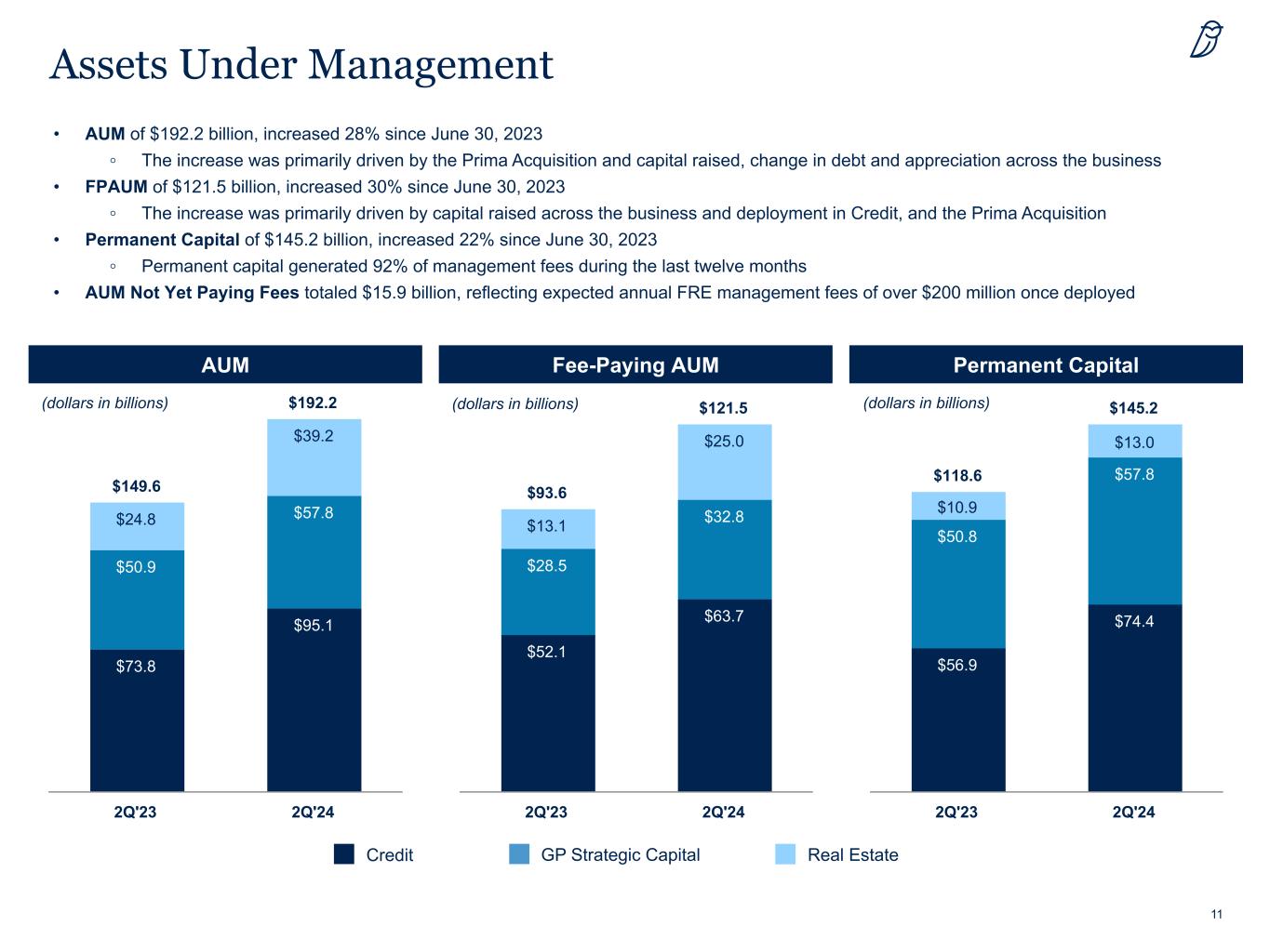 10 Historical Trends (Non-GAAP) • FRE Management Fees of $1,752.9 million for the last twelve months, increased 21% compared to prior year • Fee-Related Earnings of $1,113.4 million for the last twelve months, increased 23% compared to prior year • Distributable Earnings of $1,004.9 million for the last twelve months, increased 19% compared to prior year FRE Management Fees Distributable EarningsFee-Related Earnings (dollars in millions) (dollars in millions) (dollars in millions) $227.0 $273.0 $842.7 $1,004.9 2Q'23 2Q'24 2Q'23 (LTM) 2Q'24 (LTM) $244.6 $296.5 $902.2 $1,113.4 2Q'23 2Q'24 2Q'23 (LTM) 2Q'24 (LTM) $381.6 $476.4 $1,449.4 $1,752.9 2Q'23 2Q'24 2Q'23 (LTM) 2Q'24 (LTM) For information on and reconciliation of the Company's non-GAAP measures, please see slides 24 to 27.