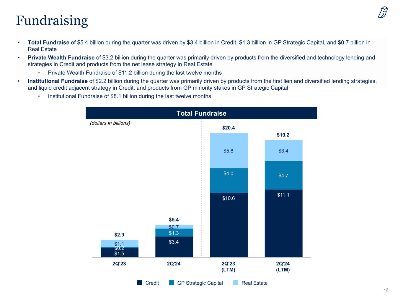 11 Assets Under Management • AUM of $192.2 billion, increased 28% since June 30, 2023 ◦ The increase was primarily driven by the Prima Acquisition and capital raised, change in debt and appreciation across the business • FPAUM of $121.5 billion, increased 30% since June 30, 2023 ◦ The increase was primarily driven by capital raised across the business and deployment in Credit, and the Prima Acquisition • Permanent Capital of $145.2 billion, increased 22% since June 30, 2023 ◦ Permanent capital generated 92% of management fees during the last twelve months • AUM Not Yet Paying Fees totaled $15.9 billion, reflecting expected annual FRE management fees of over $200 million once deployed AUM Fee-Paying AUM Permanent Capital Credit GP Strategic Capital Real Estate (dollars in billions) (dollars in billions) (dollars in billions) $149.6 $192.2 $73.8 $95.1 $50.9 $57.8$24.8 $39.2 2Q'23 2Q'24 $93.6 $121.5 $52.1 $63.7 $28.5 $32.8$13.1 $25.0 2Q'23 2Q'24 $118.6 $145.2 $56.9 $74.4 $50.8 $57.8 $10.9 $13.0 2Q'23 2Q'24